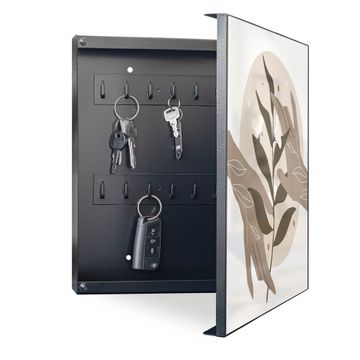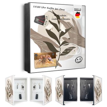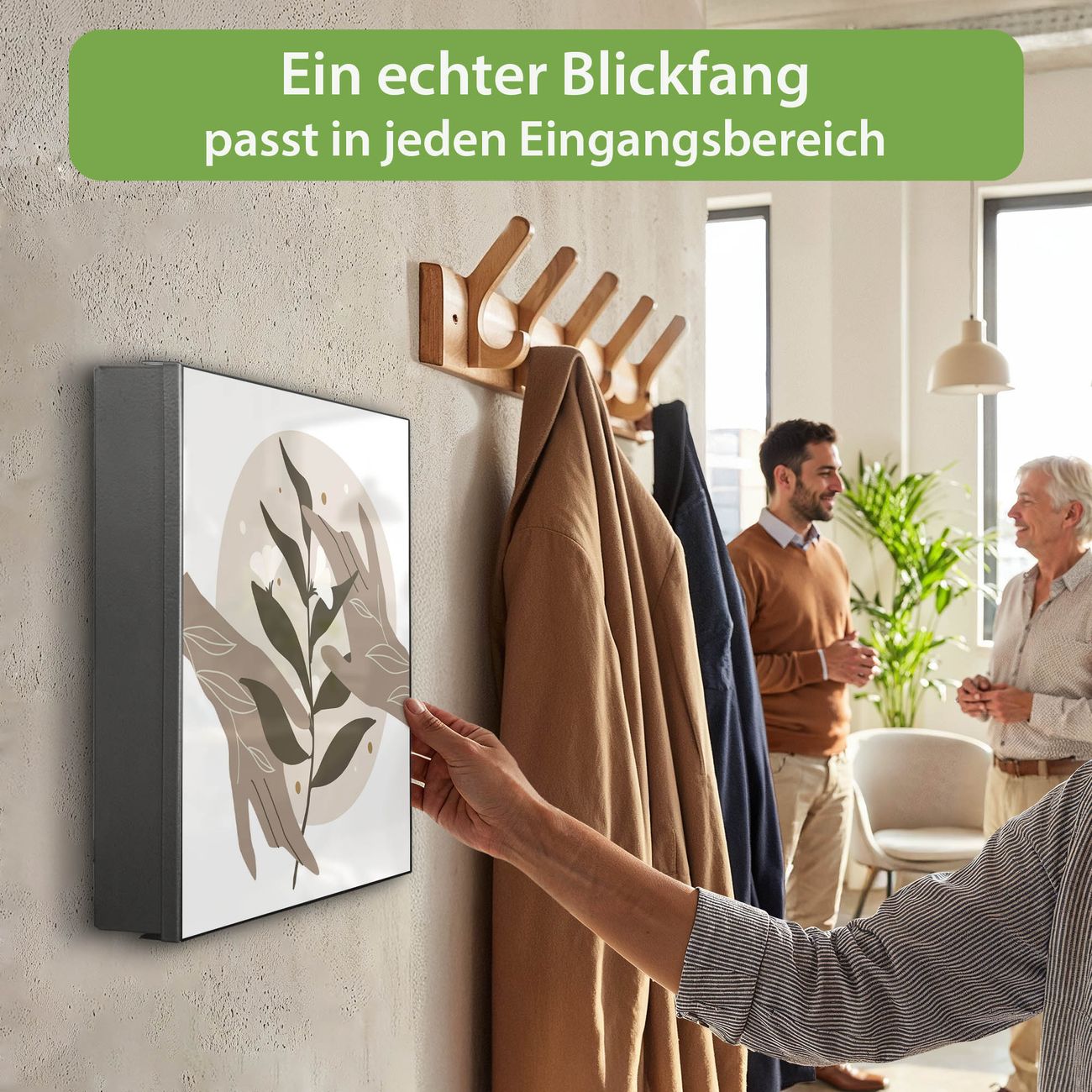 Bringe Ordnung und Eleganz in deinen Eingangsbereich mit dem banjado Schlüsselkasten Motiv Motiv Zarte Berührung Boho. Die moderne Schlüsselbox kombiniert funktionales Design mit hochwertiger Verarbeitung und wird so zu einem echten Hingucker in Flur, Büro oder Ferienwohnung. ✅ Stilvolle Schlüsselaufbewahrung mit Motiv Motiv Zarte Berührung Boho Der Design-Schlüsselkasten Motiv Motiv Zarte Berührung Boho bietet Platz für bis zu 32 Schlüssel, die auf 4 stabilen Reihen mit je 8 Haken übersichtlich verstaut werden. Mit seinen kompakten Maßen von 30 x 30 x 5 cm passt die Schlüsselbox perfekt auch in kleinere Räume. Der schwarz lackierte Stahlkorpus mit rechts angeschlagenem Türscharnier harmoniert mit gedruckten Folie auf der Front und fügt sich nahtlos in jedes Wohnambiente ein. Ob als Schlüsselorganizer für Zuhause oder als praktische Lösung für Büros, Praxen und Gewerbe, der banjado Schlüsselkasten sorgt für Ordnung und Übersicht. Dank der magnetischen, mit Kreidestiften beschreibbaren Folie auf der Front kannst du Notizen anheften oder Termine direkt auf der Oberfläche festhalten. Die Schlüsselbox Motiv Motiv Zarte Berührung Boho zur Wandmontage wird inklusive Befestigungsmaterial geliefert und ist schnell angebracht. So hast du deine Schlüssel jederzeit griffbereit und zugleich stilvoll verstaut. Mit diesem banjado Schlüsselkasten Motiv Motiv Zarte Berührung Boho kombinierst du praktische Aufbewahrung mit stilvollem Wohndesign. Ob privat oder geschäftlich, die Schlüsselbox sorgt für mehr Ordnung, Übersicht und ein wohnliches Ambiente.Vorteile im Überblick