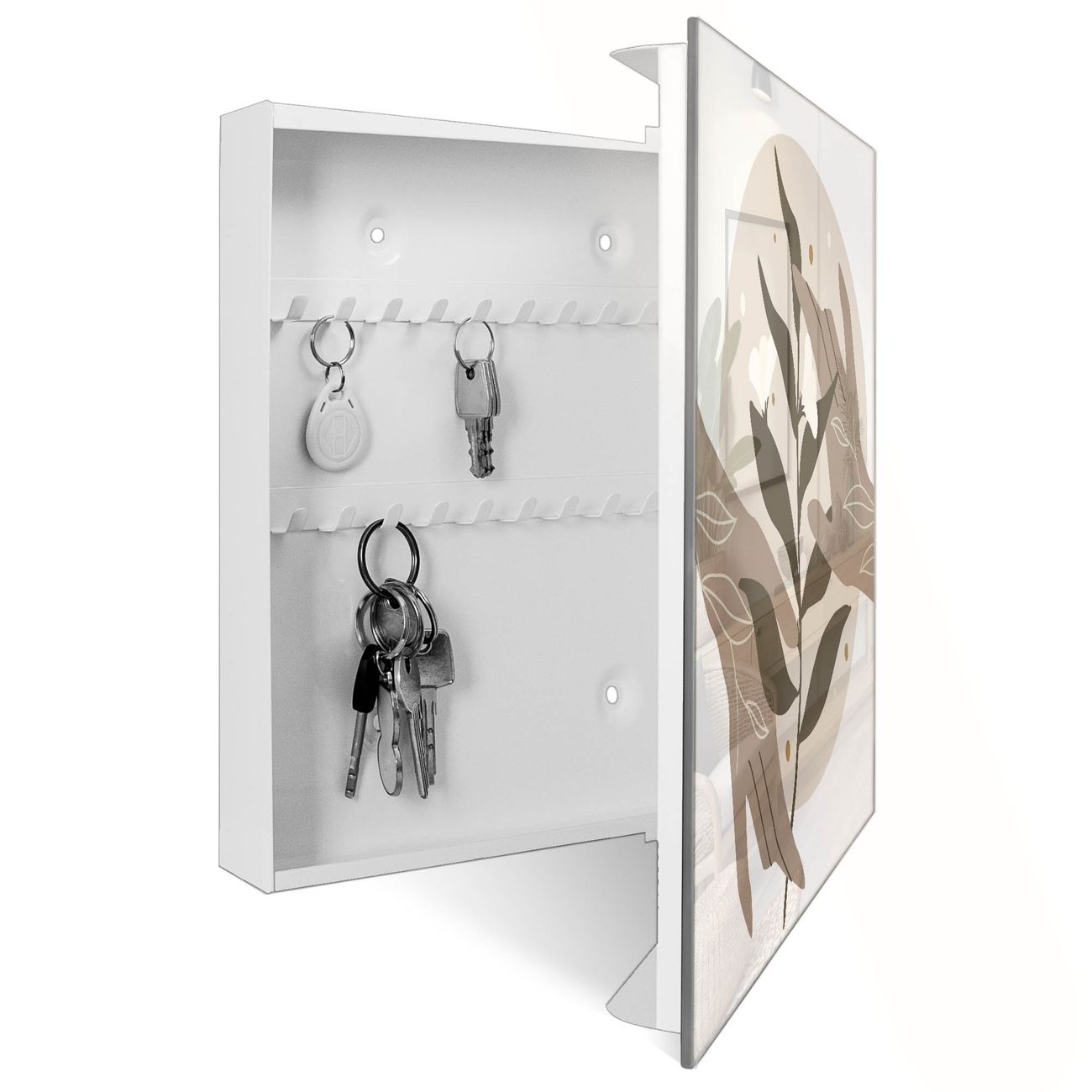 Bringe Ordnung und Eleganz in deinen Eingangsbereich mit dem banjado Schlüsselkasten Motiv Motiv Zarte Berührung. Die moderne Schlüsselbox kombiniert funktionales Design mit hochwertiger Verarbeitung und wird so zu einem echten Hingucker in Flur, Büro oder Ferienwohnung. ✅ Stilvolle Schlüsselaufbewahrung mit Glasfront im Motiv Motiv Zarte Berührung Der Design-Schlüsselkasten Motiv Motiv Zarte Berührung bietet Platz für bis zu 50 Schlüssel, die auf 5 stabilen Reihen mit je 10 Haken übersichtlich verstaut werden. Mit seinen kompakten Maßen von 30 x 30 x 5 cm passt die Schlüsselbox perfekt auch in kleinere Räume. Der weiß lackierte Stahlkorpus mit rechts angeschlagenem Türscharnier harmoniert mit der Glasfront und fügt sich nahtlos in jedes Wohnambiente ein. Ob als Schlüsselorganizer für Zuhause oder als praktische Lösung für Büros, Praxen und Gewerbe, der banjado Schlüsselkasten sorgt für Ordnung und Übersicht. Dank der magnetischen, mit Kreidestiften beschreibbaren Glasfront kannst du Notizen anheften oder Termine direkt auf der Oberfläche festhalten. Die Schlüsselbox Motiv Motiv Zarte Berührung zur Wandmontage wird inklusive Befestigungsmaterial geliefert und ist schnell angebracht. So hast du deine Schlüssel jederzeit griffbereit und zugleich stilvoll verstaut. Mit diesem banjado Schlüsselkasten Motiv Motiv Zarte Berührung kombinierst du praktische Aufbewahrung mit stilvollem Wohndesign. Ob privat oder geschäftlich, die Schlüsselbox sorgt für mehr Ordnung, Übersicht und ein wohnliches Ambiente.Vorteile im Überblick