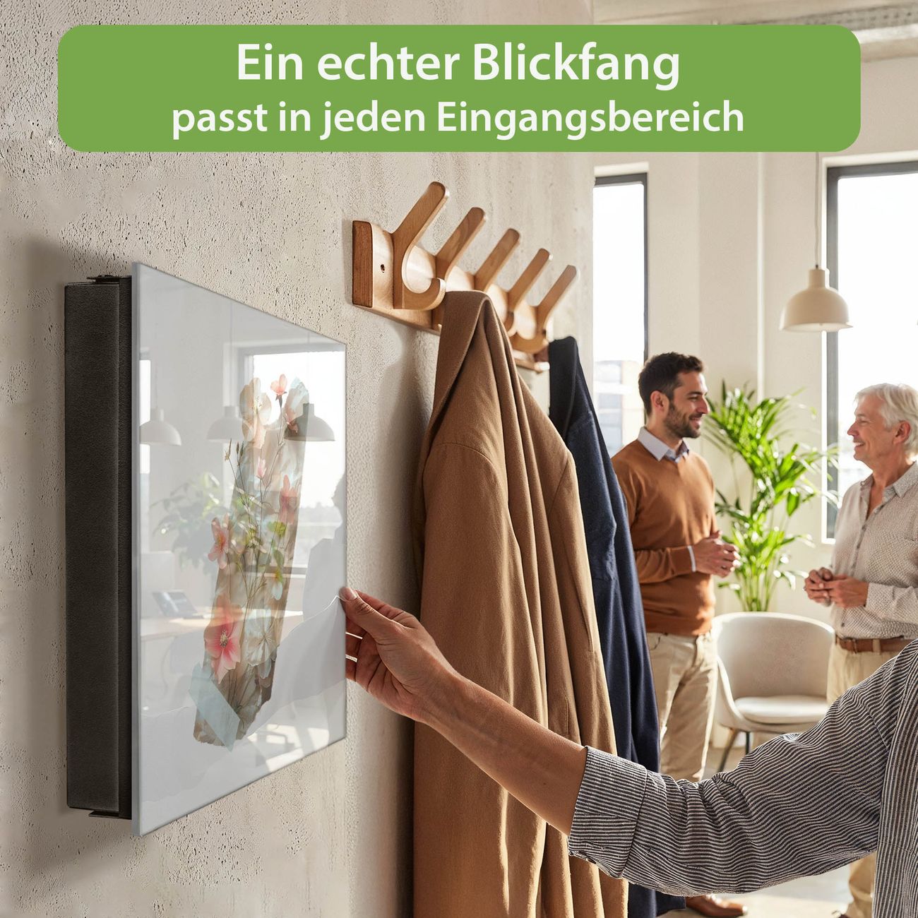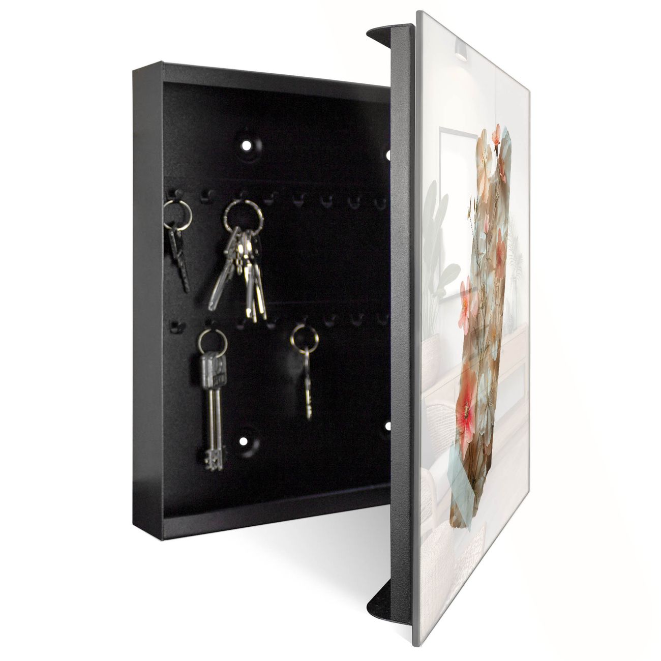 Bringe Ordnung und Eleganz in deinen Eingangsbereich mit dem banjado Schlüsselkasten Motiv Motiv Zarte Blütenkomposition. Die moderne Schlüsselbox kombiniert funktionales Design mit hochwertiger Verarbeitung und wird so zu einem echten Hingucker in Flur, Büro oder Ferienwohnung. ✅ Stilvolle Schlüsselaufbewahrung mit Glasfront im Motiv Motiv Zarte Blütenkomposition Der Design-Schlüsselkasten Motiv Motiv Zarte Blütenkomposition bietet Platz für bis zu 50 Schlüssel, die auf 5 stabilen Reihen mit je 10 Haken übersichtlich verstaut werden. Mit seinen kompakten Maßen von 30 x 30 x 5 cm passt die Schlüsselbox perfekt auch in kleinere Räume. Der schwarz lackierte Stahlkorpus mit rechts angeschlagenem Türscharnier harmoniert mit der Glasfront und fügt sich nahtlos in jedes Wohnambiente ein. Ob als Schlüsselorganizer für Zuhause oder als praktische Lösung für Büros, Praxen und Gewerbe, der banjado Schlüsselkasten sorgt für Ordnung und Übersicht. Dank der magnetischen, mit Kreidestiften beschreibbaren Glasfront kannst du Notizen anheften oder Termine direkt auf der Oberfläche festhalten. Die Schlüsselbox Motiv Motiv Zarte Blütenkomposition zur Wandmontage wird inklusive Befestigungsmaterial geliefert und ist schnell angebracht. So hast du deine Schlüssel jederzeit griffbereit und zugleich stilvoll verstaut. Mit diesem banjado Schlüsselkasten Motiv Motiv Zarte Blütenkomposition kombinierst du praktische Aufbewahrung mit stilvollem Wohndesign. Ob privat oder geschäftlich, die Schlüsselbox sorgt für mehr Ordnung, Übersicht und ein wohnliches Ambiente.Vorteile im Überblick