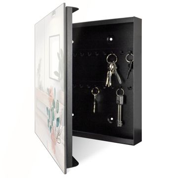 Bringe Ordnung und Eleganz in deinen Eingangsbereich mit dem banjado Schlüsselkasten Motiv Motiv Zarte Blumenkomposition. Die moderne Schlüsselbox kombiniert funktionales Design mit hochwertiger Verarbeitung und wird so zu einem echten Hingucker in Flur, Büro oder Ferienwohnung. ✅ Stilvolle Schlüsselaufbewahrung mit Glasfront im Motiv Motiv Zarte Blumenkomposition Der Design-Schlüsselkasten Motiv Motiv Zarte Blumenkomposition bietet Platz für bis zu 50 Schlüssel, die auf 5 stabilen Reihen mit je 10 Haken übersichtlich verstaut werden. Mit seinen kompakten Maßen von 30 x 30 x 5 cm passt die Schlüsselbox perfekt auch in kleinere Räume. Der schwarz lackierte Stahlkorpus mit rechts angeschlagenem Türscharnier harmoniert mit der Glasfront und fügt sich nahtlos in jedes Wohnambiente ein. Ob als Schlüsselorganizer für Zuhause oder als praktische Lösung für Büros, Praxen und Gewerbe, der banjado Schlüsselkasten sorgt für Ordnung und Übersicht. Dank der magnetischen, mit Kreidestiften beschreibbaren Glasfront kannst du Notizen anheften oder Termine direkt auf der Oberfläche festhalten. Die Schlüsselbox Motiv Motiv Zarte Blumenkomposition zur Wandmontage wird inklusive Befestigungsmaterial geliefert und ist schnell angebracht. So hast du deine Schlüssel jederzeit griffbereit und zugleich stilvoll verstaut. Mit diesem banjado Schlüsselkasten Motiv Motiv Zarte Blumenkomposition kombinierst du praktische Aufbewahrung mit stilvollem Wohndesign. Ob privat oder geschäftlich, die Schlüsselbox sorgt für mehr Ordnung, Übersicht und ein wohnliches Ambiente.Vorteile im Überblick
