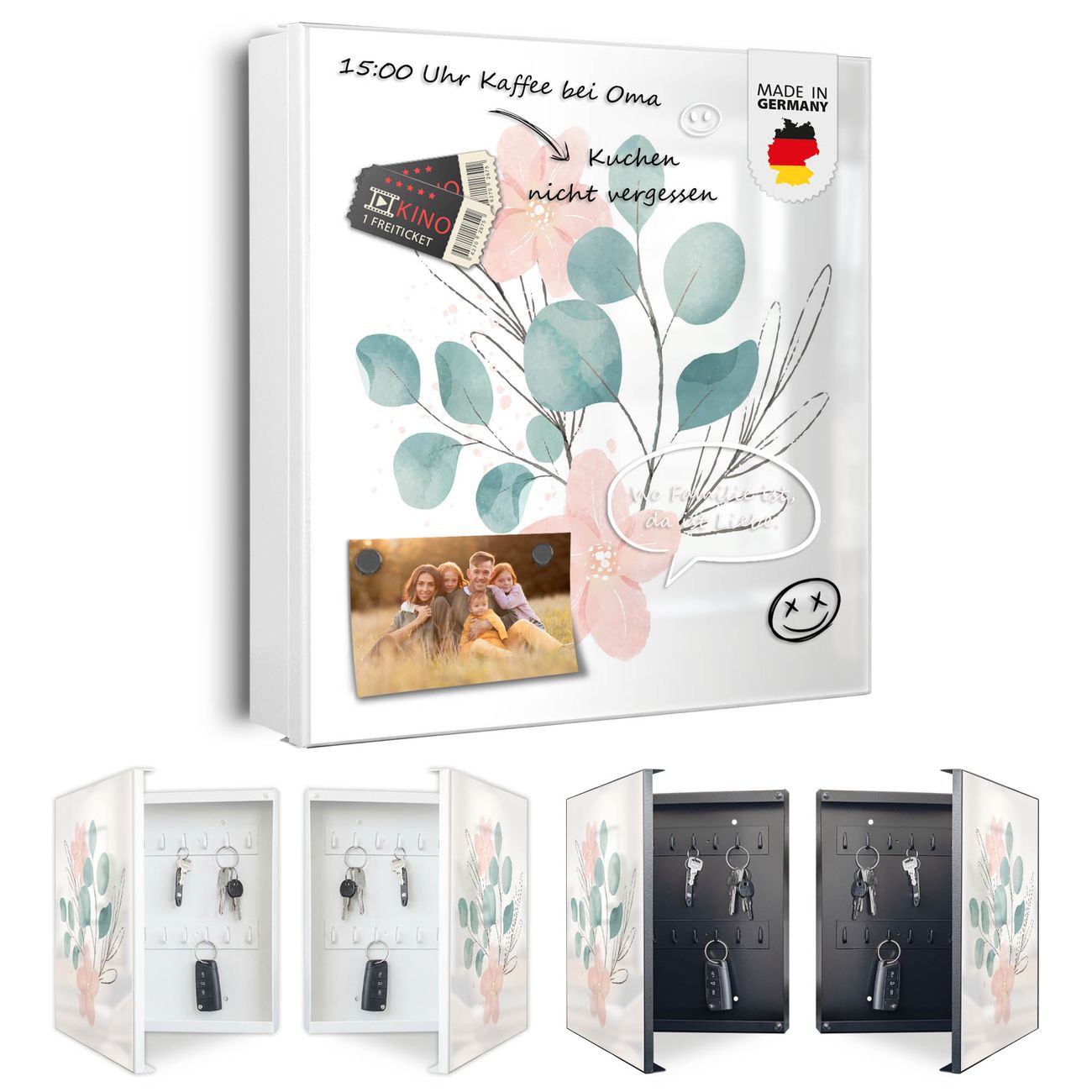 Bringe Ordnung und Eleganz in deinen Eingangsbereich mit dem banjado Schlüsselkasten Motiv Motiv Zarte Blumenkomposition. Die moderne Schlüsselbox kombiniert funktionales Design mit hochwertiger Verarbeitung und wird so zu einem echten Hingucker in Flur, Büro oder Ferienwohnung. ✅ Stilvolle Schlüsselaufbewahrung mit Motiv Motiv Zarte Blumenkomposition Der Design-Schlüsselkasten Motiv Motiv Zarte Blumenkomposition bietet Platz für bis zu 32 Schlüssel, die auf 4 stabilen Reihen mit je 8 Haken übersichtlich verstaut werden. Mit seinen kompakten Maßen von 30 x 30 x 5 cm passt die Schlüsselbox perfekt auch in kleinere Räume. Der weiß lackierte Stahlkorpus mit links angeschlagenem Türscharnier harmoniert mit gedruckten Folie auf der Front und fügt sich nahtlos in jedes Wohnambiente ein. Ob als Schlüsselorganizer für Zuhause oder als praktische Lösung für Büros, Praxen und Gewerbe, der banjado Schlüsselkasten sorgt für Ordnung und Übersicht. Dank der magnetischen, mit Kreidestiften beschreibbaren Folie auf der Front kannst du Notizen anheften oder Termine direkt auf der Oberfläche festhalten. Die Schlüsselbox Motiv Motiv Zarte Blumenkomposition zur Wandmontage wird inklusive Befestigungsmaterial geliefert und ist schnell angebracht. So hast du deine Schlüssel jederzeit griffbereit und zugleich stilvoll verstaut. Mit diesem banjado Schlüsselkasten Motiv Motiv Zarte Blumenkomposition kombinierst du praktische Aufbewahrung mit stilvollem Wohndesign. Ob privat oder geschäftlich, die Schlüsselbox sorgt für mehr Ordnung, Übersicht und ein wohnliches Ambiente.Vorteile im Überblick