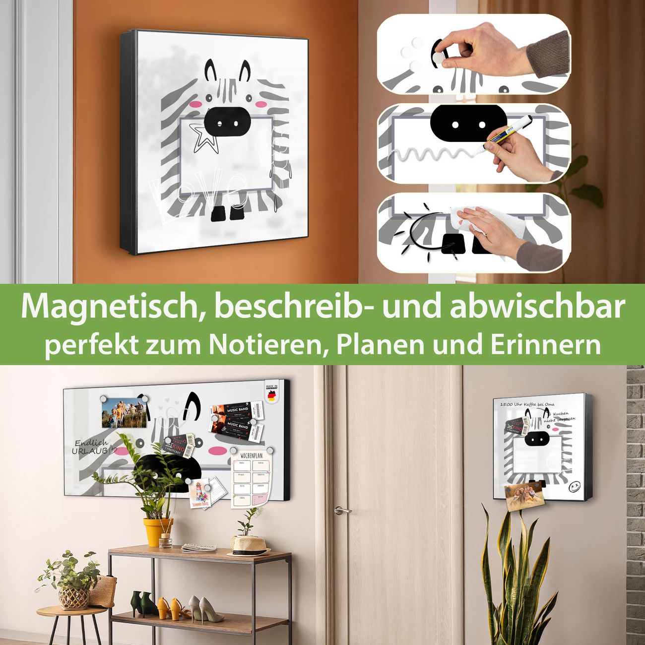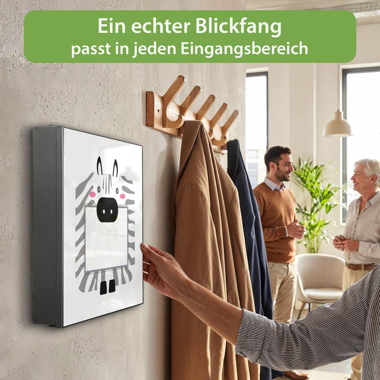 Bringe Ordnung und Eleganz in deinen Eingangsbereich mit dem banjado Schlüsselkasten Motiv Motiv Zebra Bilderrahmen. Die moderne Schlüsselbox kombiniert funktionales Design mit hochwertiger Verarbeitung und wird so zu einem echten Hingucker in Flur, Büro oder Ferienwohnung. ✅ Stilvolle Schlüsselaufbewahrung mit Motiv Motiv Zebra Bilderrahmen Der Design-Schlüsselkasten Motiv Motiv Zebra Bilderrahmen bietet Platz für bis zu 32 Schlüssel, die auf 4 stabilen Reihen mit je 8 Haken übersichtlich verstaut werden. Mit seinen kompakten Maßen von 30 x 30 x 5 cm passt die Schlüsselbox perfekt auch in kleinere Räume. Der schwarz lackierte Stahlkorpus mit rechts angeschlagenem Türscharnier harmoniert mit gedruckten Folie auf der Front und fügt sich nahtlos in jedes Wohnambiente ein. Ob als Schlüsselorganizer für Zuhause oder als praktische Lösung für Büros, Praxen und Gewerbe, der banjado Schlüsselkasten sorgt für Ordnung und Übersicht. Dank der magnetischen, mit Kreidestiften beschreibbaren Folie auf der Front kannst du Notizen anheften oder Termine direkt auf der Oberfläche festhalten. Die Schlüsselbox Motiv Motiv Zebra Bilderrahmen zur Wandmontage wird inklusive Befestigungsmaterial geliefert und ist schnell angebracht. So hast du deine Schlüssel jederzeit griffbereit und zugleich stilvoll verstaut. Mit diesem banjado Schlüsselkasten Motiv Motiv Zebra Bilderrahmen kombinierst du praktische Aufbewahrung mit stilvollem Wohndesign. Ob privat oder geschäftlich, die Schlüsselbox sorgt für mehr Ordnung, Übersicht und ein wohnliches Ambiente.Vorteile im Überblick