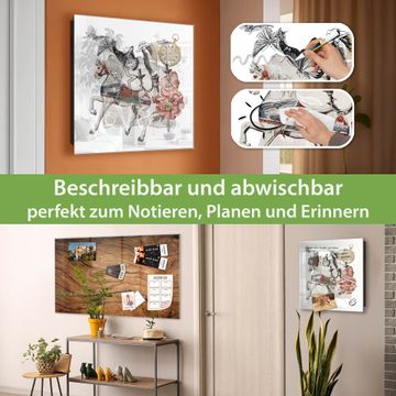 Bringe Ordnung und Eleganz in deinen Eingangsbereich mit dem banjado Schlüsselkasten Motiv Motiv Zeitreise-Kollage. Die moderne Schlüsselbox kombiniert funktionales Design mit hochwertiger Verarbeitung und wird so zu einem echten Hingucker in Flur, Büro oder Ferienwohnung. ✅ Stilvolle Schlüsselaufbewahrung mit Glasfront im Motiv Motiv Zeitreise-Kollage Der Design-Schlüsselkasten Motiv Motiv Zeitreise-Kollage bietet Platz für bis zu 50 Schlüssel, die auf 5 stabilen Reihen mit je 10 Haken übersichtlich verstaut werden. Mit seinen kompakten Maßen von 30 x 30 x 5 cm passt die Schlüsselbox perfekt auch in kleinere Räume. Der schwarz lackierte Stahlkorpus mit rechts angeschlagenem Türscharnier harmoniert mit der Glasfront und fügt sich nahtlos in jedes Wohnambiente ein. Ob als Schlüsselorganizer für Zuhause oder als praktische Lösung für Büros, Praxen und Gewerbe, der banjado Schlüsselkasten sorgt für Ordnung und Übersicht. Dank der magnetischen, mit Kreidestiften beschreibbaren Glasfront kannst du Notizen anheften oder Termine direkt auf der Oberfläche festhalten. Die Schlüsselbox Motiv Motiv Zeitreise-Kollage zur Wandmontage wird inklusive Befestigungsmaterial geliefert und ist schnell angebracht. So hast du deine Schlüssel jederzeit griffbereit und zugleich stilvoll verstaut. Mit diesem banjado Schlüsselkasten Motiv Motiv Zeitreise-Kollage kombinierst du praktische Aufbewahrung mit stilvollem Wohndesign. Ob privat oder geschäftlich, die Schlüsselbox sorgt für mehr Ordnung, Übersicht und ein wohnliches Ambiente.Vorteile im Überblick