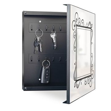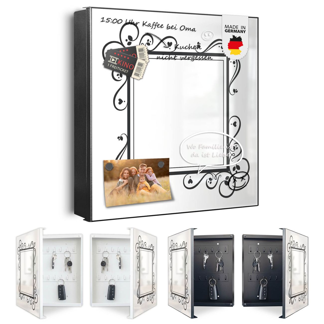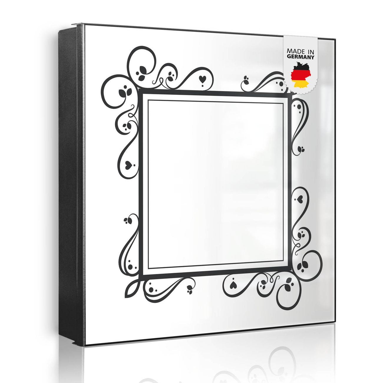 Bringe Ordnung und Eleganz in deinen Eingangsbereich mit dem banjado Schlüsselkasten Motiv Motiv Zierlicher Rahmen mit Herzen. Die moderne Schlüsselbox kombiniert funktionales Design mit hochwertiger Verarbeitung und wird so zu einem echten Hingucker in Flur, Büro oder Ferienwohnung. ✅ Stilvolle Schlüsselaufbewahrung mit Motiv Motiv Zierlicher Rahmen mit Herzen Der Design-Schlüsselkasten Motiv Motiv Zierlicher Rahmen mit Herzen bietet Platz für bis zu 32 Schlüssel, die auf 4 stabilen Reihen mit je 8 Haken übersichtlich verstaut werden. Mit seinen kompakten Maßen von 30 x 30 x 5 cm passt die Schlüsselbox perfekt auch in kleinere Räume. Der schwarz lackierte Stahlkorpus mit rechts angeschlagenem Türscharnier harmoniert mit gedruckten Folie auf der Front und fügt sich nahtlos in jedes Wohnambiente ein. Ob als Schlüsselorganizer für Zuhause oder als praktische Lösung für Büros, Praxen und Gewerbe, der banjado Schlüsselkasten sorgt für Ordnung und Übersicht. Dank der magnetischen, mit Kreidestiften beschreibbaren Folie auf der Front kannst du Notizen anheften oder Termine direkt auf der Oberfläche festhalten. Die Schlüsselbox Motiv Motiv Zierlicher Rahmen mit Herzen zur Wandmontage wird inklusive Befestigungsmaterial geliefert und ist schnell angebracht. So hast du deine Schlüssel jederzeit griffbereit und zugleich stilvoll verstaut. Mit diesem banjado Schlüsselkasten Motiv Motiv Zierlicher Rahmen mit Herzen kombinierst du praktische Aufbewahrung mit stilvollem Wohndesign. Ob privat oder geschäftlich, die Schlüsselbox sorgt für mehr Ordnung, Übersicht und ein wohnliches Ambiente.Vorteile im Überblick