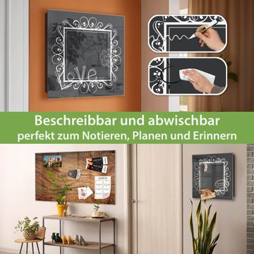 Bringe Ordnung und Eleganz in deinen Eingangsbereich mit dem banjado Schlüsselkasten Motiv Motiv Zierrahmen Grau-Weiß. Die moderne Schlüsselbox kombiniert funktionales Design mit hochwertiger Verarbeitung und wird so zu einem echten Hingucker in Flur, Büro oder Ferienwohnung. ✅ Stilvolle Schlüsselaufbewahrung mit Glasfront im Motiv Motiv Zierrahmen Grau-Weiß Der Design-Schlüsselkasten Motiv Motiv Zierrahmen Grau-Weiß bietet Platz für bis zu 50 Schlüssel, die auf 5 stabilen Reihen mit je 10 Haken übersichtlich verstaut werden. Mit seinen kompakten Maßen von 30 x 30 x 5 cm passt die Schlüsselbox perfekt auch in kleinere Räume. Der schwarz lackierte Stahlkorpus mit rechts angeschlagenem Türscharnier harmoniert mit der Glasfront und fügt sich nahtlos in jedes Wohnambiente ein. Ob als Schlüsselorganizer für Zuhause oder als praktische Lösung für Büros, Praxen und Gewerbe, der banjado Schlüsselkasten sorgt für Ordnung und Übersicht. Dank der magnetischen, mit Kreidestiften beschreibbaren Glasfront kannst du Notizen anheften oder Termine direkt auf der Oberfläche festhalten. Die Schlüsselbox Motiv Motiv Zierrahmen Grau-Weiß zur Wandmontage wird inklusive Befestigungsmaterial geliefert und ist schnell angebracht. So hast du deine Schlüssel jederzeit griffbereit und zugleich stilvoll verstaut. Mit diesem banjado Schlüsselkasten Motiv Motiv Zierrahmen Grau-Weiß kombinierst du praktische Aufbewahrung mit stilvollem Wohndesign. Ob privat oder geschäftlich, die Schlüsselbox sorgt für mehr Ordnung, Übersicht und ein wohnliches Ambiente.Vorteile im Überblick