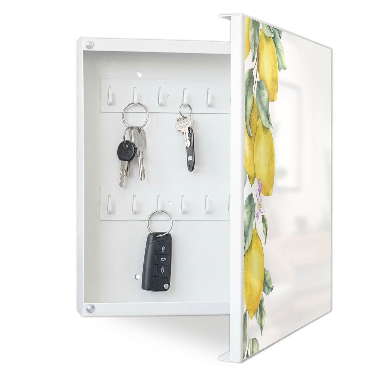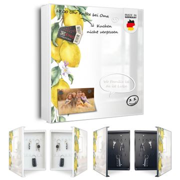 Bringe Ordnung und Eleganz in deinen Eingangsbereich mit dem banjado Schlüsselkasten Motiv Motiv Zitronenzweig Aquarell. Die moderne Schlüsselbox kombiniert funktionales Design mit hochwertiger Verarbeitung und wird so zu einem echten Hingucker in Flur, Büro oder Ferienwohnung. ✅ Stilvolle Schlüsselaufbewahrung mit Motiv Motiv Zitronenzweig Aquarell Der Design-Schlüsselkasten Motiv Motiv Zitronenzweig Aquarell bietet Platz für bis zu 32 Schlüssel, die auf 4 stabilen Reihen mit je 8 Haken übersichtlich verstaut werden. Mit seinen kompakten Maßen von 30 x 30 x 5 cm passt die Schlüsselbox perfekt auch in kleinere Räume. Der weiß lackierte Stahlkorpus mit rechts angeschlagenem Türscharnier harmoniert mit gedruckten Folie auf der Front und fügt sich nahtlos in jedes Wohnambiente ein. Ob als Schlüsselorganizer für Zuhause oder als praktische Lösung für Büros, Praxen und Gewerbe, der banjado Schlüsselkasten sorgt für Ordnung und Übersicht. Dank der magnetischen, mit Kreidestiften beschreibbaren Folie auf der Front kannst du Notizen anheften oder Termine direkt auf der Oberfläche festhalten. Die Schlüsselbox Motiv Motiv Zitronenzweig Aquarell zur Wandmontage wird inklusive Befestigungsmaterial geliefert und ist schnell angebracht. So hast du deine Schlüssel jederzeit griffbereit und zugleich stilvoll verstaut. Mit diesem banjado Schlüsselkasten Motiv Motiv Zitronenzweig Aquarell kombinierst du praktische Aufbewahrung mit stilvollem Wohndesign. Ob privat oder geschäftlich, die Schlüsselbox sorgt für mehr Ordnung, Übersicht und ein wohnliches Ambiente.Vorteile im Überblick