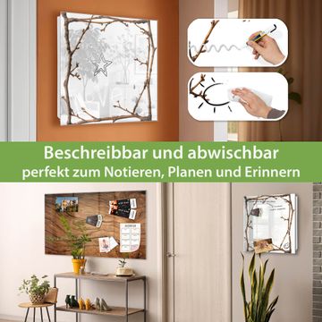 Bringe Ordnung und Eleganz in deinen Eingangsbereich mit dem banjado Schlüsselkasten Motiv Motiv Zweigrahmen. Die moderne Schlüsselbox kombiniert funktionales Design mit hochwertiger Verarbeitung und wird so zu einem echten Hingucker in Flur, Büro oder Ferienwohnung. ✅ Stilvolle Schlüsselaufbewahrung mit Glasfront im Motiv Motiv Zweigrahmen Der Design-Schlüsselkasten Motiv Motiv Zweigrahmen bietet Platz für bis zu 50 Schlüssel, die auf 5 stabilen Reihen mit je 10 Haken übersichtlich verstaut werden. Mit seinen kompakten Maßen von 30 x 30 x 5 cm passt die Schlüsselbox perfekt auch in kleinere Räume. Der weiß lackierte Stahlkorpus mit rechts angeschlagenem Türscharnier harmoniert mit der Glasfront und fügt sich nahtlos in jedes Wohnambiente ein. Ob als Schlüsselorganizer für Zuhause oder als praktische Lösung für Büros, Praxen und Gewerbe, der banjado Schlüsselkasten sorgt für Ordnung und Übersicht. Dank der magnetischen, mit Kreidestiften beschreibbaren Glasfront kannst du Notizen anheften oder Termine direkt auf der Oberfläche festhalten. Die Schlüsselbox Motiv Motiv Zweigrahmen zur Wandmontage wird inklusive Befestigungsmaterial geliefert und ist schnell angebracht. So hast du deine Schlüssel jederzeit griffbereit und zugleich stilvoll verstaut. Mit diesem banjado Schlüsselkasten Motiv Motiv Zweigrahmen kombinierst du praktische Aufbewahrung mit stilvollem Wohndesign. Ob privat oder geschäftlich, die Schlüsselbox sorgt für mehr Ordnung, Übersicht und ein wohnliches Ambiente.Vorteile im Überblick
