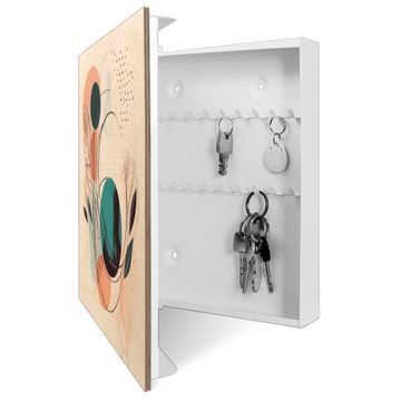 Bringe Ordnung und Eleganz in deinen Eingangsbereich mit dem banjado Schlüsselkasten Motiv Motiv Abstrakte Formen. Die moderne Schlüsselbox kombiniert funktionales Design mit hochwertiger Verarbeitung und wird so zu einem echten Hingucker in Flur, Büro oder Ferienwohnung. ✅ Stilvolle Schlüsselaufbewahrung mit moderner Holzfront im Motiv Motiv Abstrakte Formen Der Design-Schlüsselkasten Motiv Motiv Abstrakte Formen bietet Platz für bis zu 50 Schlüssel, die auf 5 stabilen Reihen mit je 10 Haken übersichtlich verstaut werden. Mit seinen kompakten Maßen von 30 x 30 x 5 cm passt die Schlüsselbox perfekt auch in kleinere Räume. Der weiß lackierte Korpus mit dem Scharnier auf der linken Seite harmoniert mit der bedruckten Holzfront und fügt sich nahtlos in jedes Wohnambiente ein. Ob als Schlüsselorganizer für Zuhause oder als praktische Lösung für Büros, Praxen und Gewerbe - der banjado Schlüsselkasten sorgt für Ordnung und Übersicht. Durch die klare Strukturierung der Haken lassen sich auch viele Schlüssel problemlos verwalten. Die Schlüsselbox Motiv Motiv Abstrakte Formen zur Wandmontage wird inklusive Befestigungsmaterial geliefert und ist schnell angebracht. So hast du deine Schlüssel jederzeit griffbereit und zugleich stilvoll verstaut. Mit diesem banjado Schlüsselkasten Motiv Motiv Abstrakte Formen kombinierst du praktische Aufbewahrung mit stilvollem Wohndesign. Ob privat oder geschäftlich - die Schlüsselbox sorgt für mehr Ordnung, Übersicht und ein wohnliches Ambiente.Vorteile im Überblick