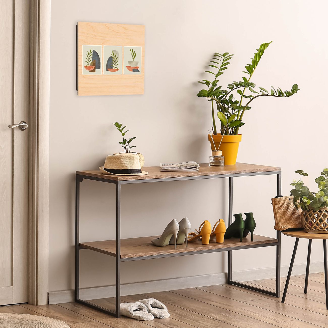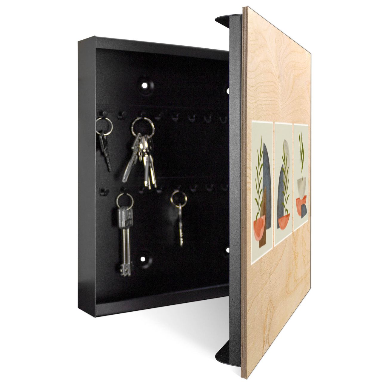 Bringe Ordnung und Eleganz in deinen Eingangsbereich mit dem banjado Schlüsselkasten Motiv Motiv Abstrakte Naturgeometrie. Die moderne Schlüsselbox kombiniert funktionales Design mit hochwertiger Verarbeitung und wird so zu einem echten Hingucker in Flur, Büro oder Ferienwohnung. ✅ Stilvolle Schlüsselaufbewahrung mit moderner Holzfront im Motiv Motiv Abstrakte Naturgeometrie Der Design-Schlüsselkasten Motiv Motiv Abstrakte Naturgeometrie bietet Platz für bis zu 50 Schlüssel, die auf 5 stabilen Reihen mit je 10 Haken übersichtlich verstaut werden. Mit seinen kompakten Maßen von 30 x 30 x 5 cm passt die Schlüsselbox perfekt auch in kleinere Räume. Der schwarz lackierte Korpus mit dem Scharnier auf der rechten Seite harmoniert mit der bedruckten Holzfront und fügt sich nahtlos in jedes Wohnambiente ein. Ob als Schlüsselorganizer für Zuhause oder als praktische Lösung für Büros, Praxen und Gewerbe - der banjado Schlüsselkasten sorgt für Ordnung und Übersicht. Durch die klare Strukturierung der Haken lassen sich auch viele Schlüssel problemlos verwalten. Die Schlüsselbox Motiv Motiv Abstrakte Naturgeometrie zur Wandmontage wird inklusive Befestigungsmaterial geliefert und ist schnell angebracht. So hast du deine Schlüssel jederzeit griffbereit und zugleich stilvoll verstaut. Mit diesem banjado Schlüsselkasten Motiv Motiv Abstrakte Naturgeometrie kombinierst du praktische Aufbewahrung mit stilvollem Wohndesign. Ob privat oder geschäftlich - die Schlüsselbox sorgt für mehr Ordnung, Übersicht und ein wohnliches Ambiente.Vorteile im Überblick