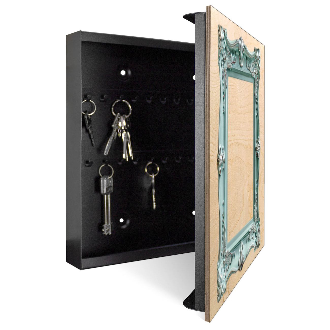 Schlüsselkasten mit Holzfront - Design Schlüsselbox Motiv Barockrahmen in Türkis
