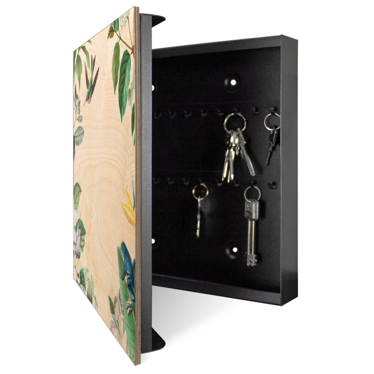 Bringe Ordnung und Eleganz in deinen Eingangsbereich mit dem banjado Schlüsselkasten Motiv Motiv Exotisches Paradies. Die moderne Schlüsselbox kombiniert funktionales Design mit hochwertiger Verarbeitung und wird so zu einem echten Hingucker in Flur, Büro oder Ferienwohnung. ✅ Stilvolle Schlüsselaufbewahrung mit moderner Holzfront im Motiv Motiv Exotisches Paradies Der Design-Schlüsselkasten Motiv Motiv Exotisches Paradies bietet Platz für bis zu 50 Schlüssel, die auf 5 stabilen Reihen mit je 10 Haken übersichtlich verstaut werden. Mit seinen kompakten Maßen von 30 x 30 x 5 cm passt die Schlüsselbox perfekt auch in kleinere Räume. Der schwarz lackierte Korpus mit dem Scharnier auf der linken Seite harmoniert mit der bedruckten Holzfront und fügt sich nahtlos in jedes Wohnambiente ein. Ob als Schlüsselorganizer für Zuhause oder als praktische Lösung für Büros, Praxen und Gewerbe - der banjado Schlüsselkasten sorgt für Ordnung und Übersicht. Durch die klare Strukturierung der Haken lassen sich auch viele Schlüssel problemlos verwalten. Die Schlüsselbox Motiv Motiv Exotisches Paradies zur Wandmontage wird inklusive Befestigungsmaterial geliefert und ist schnell angebracht. So hast du deine Schlüssel jederzeit griffbereit und zugleich stilvoll verstaut. Mit diesem banjado Schlüsselkasten Motiv Motiv Exotisches Paradies kombinierst du praktische Aufbewahrung mit stilvollem Wohndesign. Ob privat oder geschäftlich - die Schlüsselbox sorgt für mehr Ordnung, Übersicht und ein wohnliches Ambiente.Vorteile im Überblick