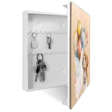 Bringe Ordnung und Eleganz in deinen Eingangsbereich mit dem banjado Schlüsselkasten Motiv Motiv Fröhliche Hundeparade. Die moderne Schlüsselbox kombiniert funktionales Design mit hochwertiger Verarbeitung und wird so zu einem echten Hingucker in Flur, Büro oder Ferienwohnung. ✅ Stilvolle Schlüsselaufbewahrung mit moderner Holzfront im Motiv Motiv Fröhliche Hundeparade Der Design-Schlüsselkasten Motiv Motiv Fröhliche Hundeparade bietet Platz für bis zu 50 Schlüssel, die auf 5 stabilen Reihen mit je 10 Haken übersichtlich verstaut werden. Mit seinen kompakten Maßen von 30 x 30 x 5 cm passt die Schlüsselbox perfekt auch in kleinere Räume. Der weiß lackierte Korpus mit dem Scharnier auf der rechten Seite harmoniert mit der bedruckten Holzfront und fügt sich nahtlos in jedes Wohnambiente ein. Ob als Schlüsselorganizer für Zuhause oder als praktische Lösung für Büros, Praxen und Gewerbe - der banjado Schlüsselkasten sorgt für Ordnung und Übersicht. Durch die klare Strukturierung der Haken lassen sich auch viele Schlüssel problemlos verwalten. Die Schlüsselbox Motiv Motiv Fröhliche Hundeparade zur Wandmontage wird inklusive Befestigungsmaterial geliefert und ist schnell angebracht. So hast du deine Schlüssel jederzeit griffbereit und zugleich stilvoll verstaut. Mit diesem banjado Schlüsselkasten Motiv Motiv Fröhliche Hundeparade kombinierst du praktische Aufbewahrung mit stilvollem Wohndesign. Ob privat oder geschäftlich - die Schlüsselbox sorgt für mehr Ordnung, Übersicht und ein wohnliches Ambiente.Vorteile im Überblick