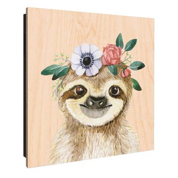 Schlüsselkasten mit Holzfront - Design Schlüsselbox Motiv Fröhliches Faultier mit Blumenkranz