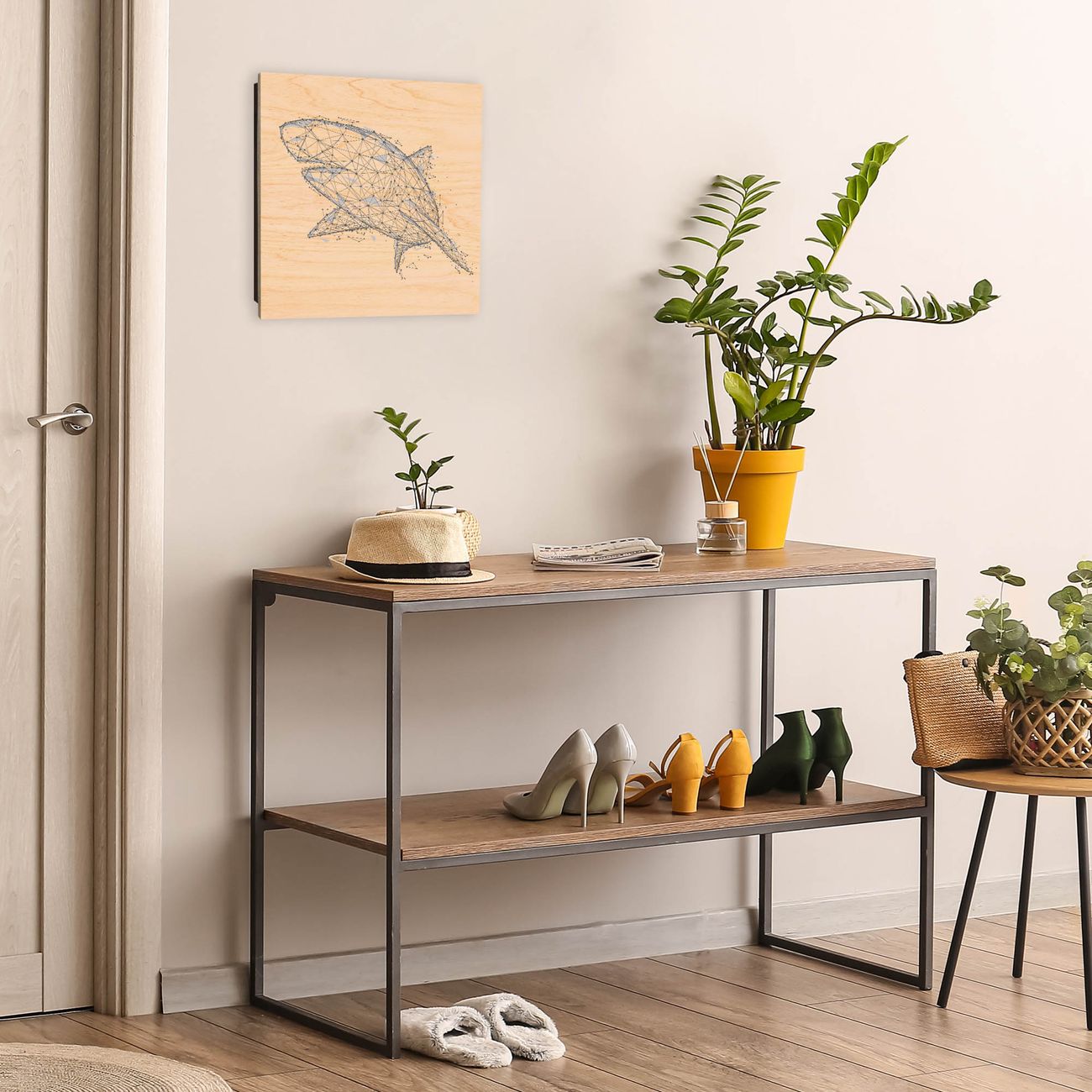 Bringe Ordnung und Eleganz in deinen Eingangsbereich mit dem banjado Schlüsselkasten Motiv Motiv Hai abstrakt 2. Die moderne Schlüsselbox kombiniert funktionales Design mit hochwertiger Verarbeitung und wird so zu einem echten Hingucker in Flur, Büro oder Ferienwohnung. ✅ Stilvolle Schlüsselaufbewahrung mit moderner Holzfront im Motiv Motiv Hai abstrakt 2 Der Design-Schlüsselkasten Motiv Motiv Hai abstrakt 2 bietet Platz für bis zu 50 Schlüssel, die auf 5 stabilen Reihen mit je 10 Haken übersichtlich verstaut werden. Mit seinen kompakten Maßen von 30 x 30 x 5 cm passt die Schlüsselbox perfekt auch in kleinere Räume. Der schwarz lackierte Korpus mit dem Scharnier auf der linken Seite harmoniert mit der bedruckten Holzfront und fügt sich nahtlos in jedes Wohnambiente ein. Ob als Schlüsselorganizer für Zuhause oder als praktische Lösung für Büros, Praxen und Gewerbe - der banjado Schlüsselkasten sorgt für Ordnung und Übersicht. Durch die klare Strukturierung der Haken lassen sich auch viele Schlüssel problemlos verwalten. Die Schlüsselbox Motiv Motiv Hai abstrakt 2 zur Wandmontage wird inklusive Befestigungsmaterial geliefert und ist schnell angebracht. So hast du deine Schlüssel jederzeit griffbereit und zugleich stilvoll verstaut. Mit diesem banjado Schlüsselkasten Motiv Motiv Hai abstrakt 2 kombinierst du praktische Aufbewahrung mit stilvollem Wohndesign. Ob privat oder geschäftlich - die Schlüsselbox sorgt für mehr Ordnung, Übersicht und ein wohnliches Ambiente.Vorteile im Überblick