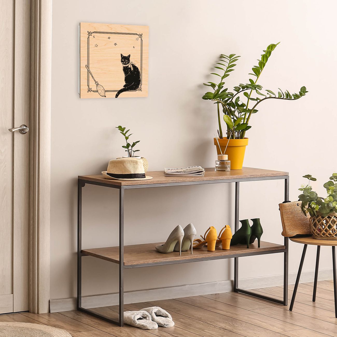 Bringe Ordnung und Eleganz in deinen Eingangsbereich mit dem banjado Schlüsselkasten Motiv Motiv Hexenkater. Die moderne Schlüsselbox kombiniert funktionales Design mit hochwertiger Verarbeitung und wird so zu einem echten Hingucker in Flur, Büro oder Ferienwohnung. ✅ Stilvolle Schlüsselaufbewahrung mit moderner Holzfront im Motiv Motiv Hexenkater Der Design-Schlüsselkasten Motiv Motiv Hexenkater bietet Platz für bis zu 50 Schlüssel, die auf 5 stabilen Reihen mit je 10 Haken übersichtlich verstaut werden. Mit seinen kompakten Maßen von 30 x 30 x 5 cm passt die Schlüsselbox perfekt auch in kleinere Räume. Der weiß lackierte Korpus mit dem Scharnier auf der rechten Seite harmoniert mit der bedruckten Holzfront und fügt sich nahtlos in jedes Wohnambiente ein. Ob als Schlüsselorganizer für Zuhause oder als praktische Lösung für Büros, Praxen und Gewerbe - der banjado Schlüsselkasten sorgt für Ordnung und Übersicht. Durch die klare Strukturierung der Haken lassen sich auch viele Schlüssel problemlos verwalten. Die Schlüsselbox Motiv Motiv Hexenkater zur Wandmontage wird inklusive Befestigungsmaterial geliefert und ist schnell angebracht. So hast du deine Schlüssel jederzeit griffbereit und zugleich stilvoll verstaut. Mit diesem banjado Schlüsselkasten Motiv Motiv Hexenkater kombinierst du praktische Aufbewahrung mit stilvollem Wohndesign. Ob privat oder geschäftlich - die Schlüsselbox sorgt für mehr Ordnung, Übersicht und ein wohnliches Ambiente.Vorteile im Überblick