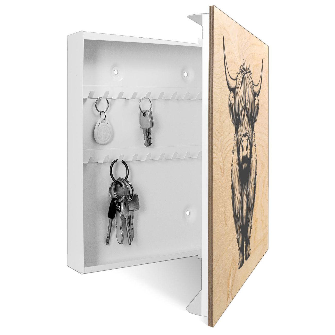 Schlüsselkasten mit Holzfront - Design Schlüsselbox Motiv Hochlandrind