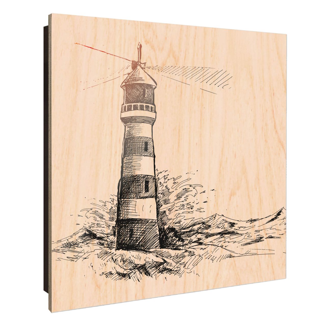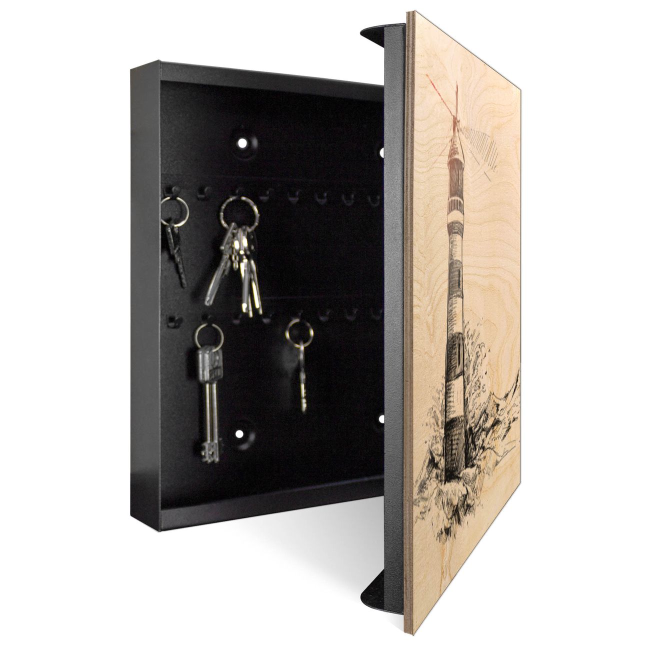 Schlüsselkasten mit Holzfront - Design Schlüsselbox Motiv Leuchtturm in der Brandung