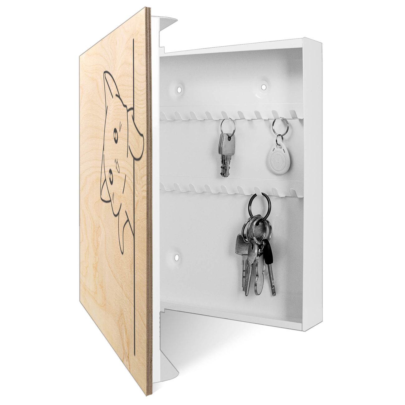 Bringe Ordnung und Eleganz in deinen Eingangsbereich mit dem banjado Schlüsselkasten Motiv Motiv Lustige Katze am Rand. Die moderne Schlüsselbox kombiniert funktionales Design mit hochwertiger Verarbeitung und wird so zu einem echten Hingucker in Flur, Büro oder Ferienwohnung. ✅ Stilvolle Schlüsselaufbewahrung mit moderner Holzfront im Motiv Motiv Lustige Katze am Rand Der Design-Schlüsselkasten Motiv Motiv Lustige Katze am Rand bietet Platz für bis zu 50 Schlüssel, die auf 5 stabilen Reihen mit je 10 Haken übersichtlich verstaut werden. Mit seinen kompakten Maßen von 30 x 30 x 5 cm passt die Schlüsselbox perfekt auch in kleinere Räume. Der weiß lackierte Korpus mit dem Scharnier auf der linken Seite harmoniert mit der bedruckten Holzfront und fügt sich nahtlos in jedes Wohnambiente ein. Ob als Schlüsselorganizer für Zuhause oder als praktische Lösung für Büros, Praxen und Gewerbe - der banjado Schlüsselkasten sorgt für Ordnung und Übersicht. Durch die klare Strukturierung der Haken lassen sich auch viele Schlüssel problemlos verwalten. Die Schlüsselbox Motiv Motiv Lustige Katze am Rand zur Wandmontage wird inklusive Befestigungsmaterial geliefert und ist schnell angebracht. So hast du deine Schlüssel jederzeit griffbereit und zugleich stilvoll verstaut. Mit diesem banjado Schlüsselkasten Motiv Motiv Lustige Katze am Rand kombinierst du praktische Aufbewahrung mit stilvollem Wohndesign. Ob privat oder geschäftlich - die Schlüsselbox sorgt für mehr Ordnung, Übersicht und ein wohnliches Ambiente.Vorteile im Überblick