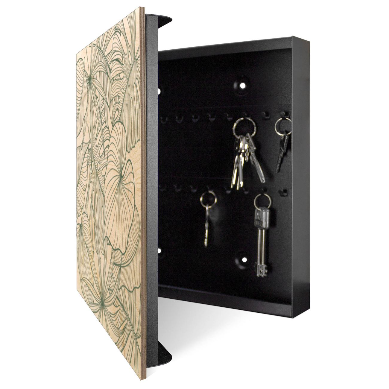 Bringe Ordnung und Eleganz in deinen Eingangsbereich mit dem banjado Schlüsselkasten Motiv Motiv Monstera 2. Die moderne Schlüsselbox kombiniert funktionales Design mit hochwertiger Verarbeitung und wird so zu einem echten Hingucker in Flur, Büro oder Ferienwohnung. ✅ Stilvolle Schlüsselaufbewahrung mit moderner Holzfront im Motiv Motiv Monstera 2 Der Design-Schlüsselkasten Motiv Motiv Monstera 2 bietet Platz für bis zu 50 Schlüssel, die auf 5 stabilen Reihen mit je 10 Haken übersichtlich verstaut werden. Mit seinen kompakten Maßen von 30 x 30 x 5 cm passt die Schlüsselbox perfekt auch in kleinere Räume. Der schwarz lackierte Korpus mit dem Scharnier auf der linken Seite harmoniert mit der bedruckten Holzfront und fügt sich nahtlos in jedes Wohnambiente ein. Ob als Schlüsselorganizer für Zuhause oder als praktische Lösung für Büros, Praxen und Gewerbe - der banjado Schlüsselkasten sorgt für Ordnung und Übersicht. Durch die klare Strukturierung der Haken lassen sich auch viele Schlüssel problemlos verwalten. Die Schlüsselbox Motiv Motiv Monstera 2 zur Wandmontage wird inklusive Befestigungsmaterial geliefert und ist schnell angebracht. So hast du deine Schlüssel jederzeit griffbereit und zugleich stilvoll verstaut. Mit diesem banjado Schlüsselkasten Motiv Motiv Monstera 2 kombinierst du praktische Aufbewahrung mit stilvollem Wohndesign. Ob privat oder geschäftlich - die Schlüsselbox sorgt für mehr Ordnung, Übersicht und ein wohnliches Ambiente.Vorteile im Überblick