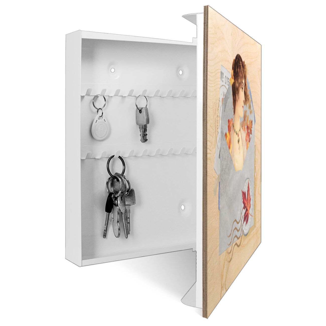 Bringe Ordnung und Eleganz in deinen Eingangsbereich mit dem banjado Schlüsselkasten Motiv Motiv Nostalgische Herbstgrüße. Die moderne Schlüsselbox kombiniert funktionales Design mit hochwertiger Verarbeitung und wird so zu einem echten Hingucker in Flur, Büro oder Ferienwohnung. ✅ Stilvolle Schlüsselaufbewahrung mit moderner Holzfront im Motiv Motiv Nostalgische Herbstgrüße Der Design-Schlüsselkasten Motiv Motiv Nostalgische Herbstgrüße bietet Platz für bis zu 50 Schlüssel, die auf 5 stabilen Reihen mit je 10 Haken übersichtlich verstaut werden. Mit seinen kompakten Maßen von 30 x 30 x 5 cm passt die Schlüsselbox perfekt auch in kleinere Räume. Der weiß lackierte Korpus mit dem Scharnier auf der rechten Seite harmoniert mit der bedruckten Holzfront und fügt sich nahtlos in jedes Wohnambiente ein. Ob als Schlüsselorganizer für Zuhause oder als praktische Lösung für Büros, Praxen und Gewerbe - der banjado Schlüsselkasten sorgt für Ordnung und Übersicht. Durch die klare Strukturierung der Haken lassen sich auch viele Schlüssel problemlos verwalten. Die Schlüsselbox Motiv Motiv Nostalgische Herbstgrüße zur Wandmontage wird inklusive Befestigungsmaterial geliefert und ist schnell angebracht. So hast du deine Schlüssel jederzeit griffbereit und zugleich stilvoll verstaut. Mit diesem banjado Schlüsselkasten Motiv Motiv Nostalgische Herbstgrüße kombinierst du praktische Aufbewahrung mit stilvollem Wohndesign. Ob privat oder geschäftlich - die Schlüsselbox sorgt für mehr Ordnung, Übersicht und ein wohnliches Ambiente.Vorteile im Überblick