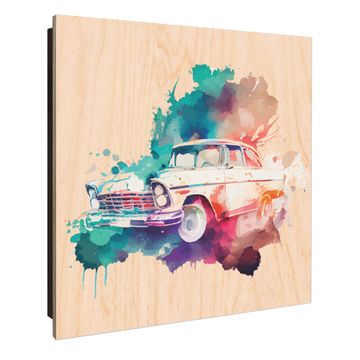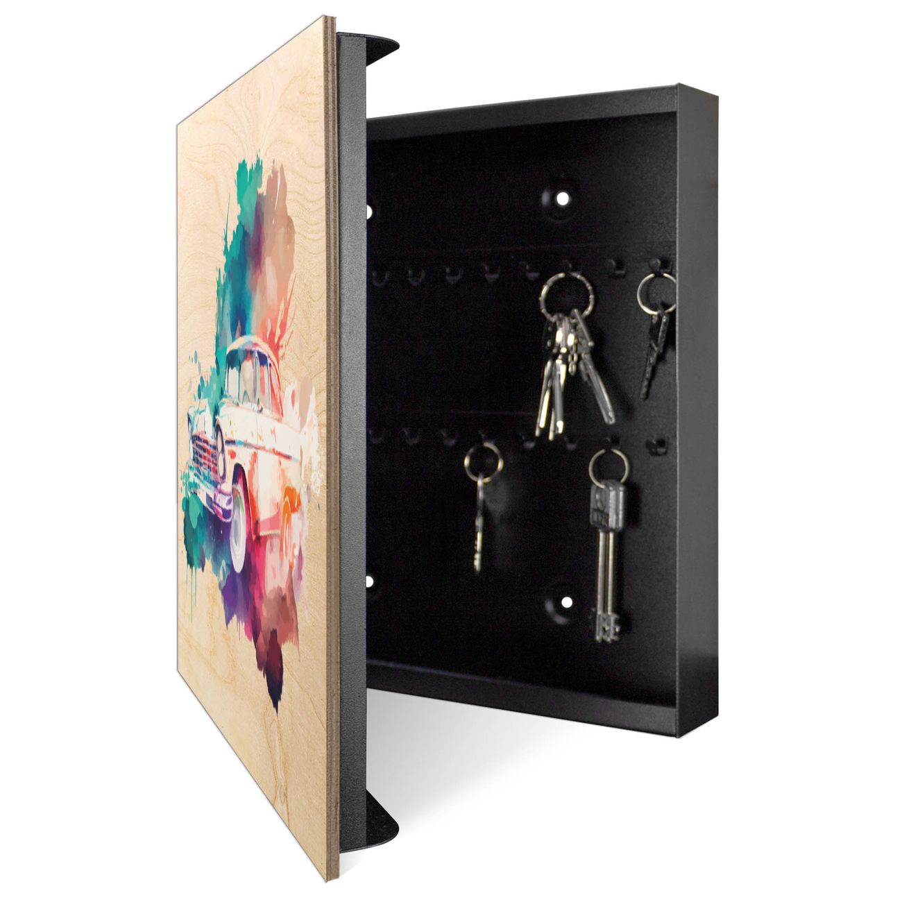 Schlüsselkasten mit Holzfront - Design Schlüsselbox Motiv Retro-Auto in Aquarell