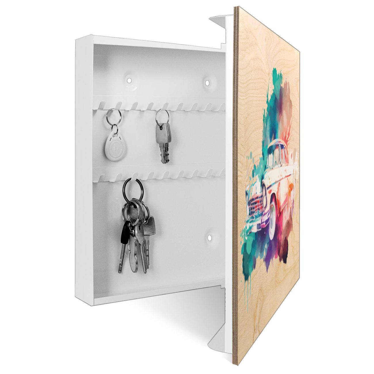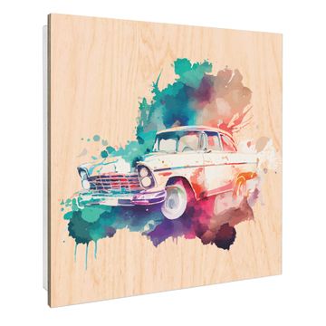 Schlüsselkasten mit Holzfront - Design Schlüsselbox Motiv Retro-Auto in Aquarell