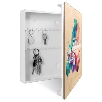 Bringe Ordnung und Eleganz in deinen Eingangsbereich mit dem banjado Schlüsselkasten Motiv Motiv Retro-Auto in Aquarell. Die moderne Schlüsselbox kombiniert funktionales Design mit hochwertiger Verarbeitung und wird so zu einem echten Hingucker in Flur, Büro oder Ferienwohnung. ✅ Stilvolle Schlüsselaufbewahrung mit moderner Holzfront im Motiv Motiv Retro-Auto in Aquarell Der Design-Schlüsselkasten Motiv Motiv Retro-Auto in Aquarell bietet Platz für bis zu 50 Schlüssel, die auf 5 stabilen Reihen mit je 10 Haken übersichtlich verstaut werden. Mit seinen kompakten Maßen von 30 x 30 x 5 cm passt die Schlüsselbox perfekt auch in kleinere Räume. Der weiß lackierte Korpus mit dem Scharnier auf der rechten Seite harmoniert mit der bedruckten Holzfront und fügt sich nahtlos in jedes Wohnambiente ein. Ob als Schlüsselorganizer für Zuhause oder als praktische Lösung für Büros, Praxen und Gewerbe - der banjado Schlüsselkasten sorgt für Ordnung und Übersicht. Durch die klare Strukturierung der Haken lassen sich auch viele Schlüssel problemlos verwalten. Die Schlüsselbox Motiv Motiv Retro-Auto in Aquarell zur Wandmontage wird inklusive Befestigungsmaterial geliefert und ist schnell angebracht. So hast du deine Schlüssel jederzeit griffbereit und zugleich stilvoll verstaut. Mit diesem banjado Schlüsselkasten Motiv Motiv Retro-Auto in Aquarell kombinierst du praktische Aufbewahrung mit stilvollem Wohndesign. Ob privat oder geschäftlich - die Schlüsselbox sorgt für mehr Ordnung, Übersicht und ein wohnliches Ambiente.Vorteile im Überblick