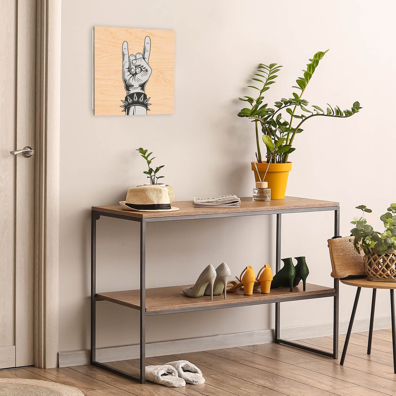 Bringe Ordnung und Eleganz in deinen Eingangsbereich mit dem banjado Schlüsselkasten Motiv Motiv Rockgruß. Die moderne Schlüsselbox kombiniert funktionales Design mit hochwertiger Verarbeitung und wird so zu einem echten Hingucker in Flur, Büro oder Ferienwohnung. ✅ Stilvolle Schlüsselaufbewahrung mit moderner Holzfront im Motiv Motiv Rockgruß Der Design-Schlüsselkasten Motiv Motiv Rockgruß bietet Platz für bis zu 50 Schlüssel, die auf 5 stabilen Reihen mit je 10 Haken übersichtlich verstaut werden. Mit seinen kompakten Maßen von 30 x 30 x 5 cm passt die Schlüsselbox perfekt auch in kleinere Räume. Der weiß lackierte Korpus mit dem Scharnier auf der rechten Seite harmoniert mit der bedruckten Holzfront und fügt sich nahtlos in jedes Wohnambiente ein. Ob als Schlüsselorganizer für Zuhause oder als praktische Lösung für Büros, Praxen und Gewerbe - der banjado Schlüsselkasten sorgt für Ordnung und Übersicht. Durch die klare Strukturierung der Haken lassen sich auch viele Schlüssel problemlos verwalten. Die Schlüsselbox Motiv Motiv Rockgruß zur Wandmontage wird inklusive Befestigungsmaterial geliefert und ist schnell angebracht. So hast du deine Schlüssel jederzeit griffbereit und zugleich stilvoll verstaut. Mit diesem banjado Schlüsselkasten Motiv Motiv Rockgruß kombinierst du praktische Aufbewahrung mit stilvollem Wohndesign. Ob privat oder geschäftlich - die Schlüsselbox sorgt für mehr Ordnung, Übersicht und ein wohnliches Ambiente.Vorteile im Überblick