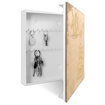 Bringe Ordnung und Eleganz in deinen Eingangsbereich mit dem banjado Schlüsselkasten Motiv Motiv Seemonster und Segelschiff. Die moderne Schlüsselbox kombiniert funktionales Design mit hochwertiger Verarbeitung und wird so zu einem echten Hingucker in Flur, Büro oder Ferienwohnung. ✅ Stilvolle Schlüsselaufbewahrung mit moderner Holzfront im Motiv Motiv Seemonster und Segelschiff Der Design-Schlüsselkasten Motiv Motiv Seemonster und Segelschiff bietet Platz für bis zu 50 Schlüssel, die auf 5 stabilen Reihen mit je 10 Haken übersichtlich verstaut werden. Mit seinen kompakten Maßen von 30 x 30 x 5 cm passt die Schlüsselbox perfekt auch in kleinere Räume. Der weiß lackierte Korpus mit dem Scharnier auf der rechten Seite harmoniert mit der bedruckten Holzfront und fügt sich nahtlos in jedes Wohnambiente ein. Ob als Schlüsselorganizer für Zuhause oder als praktische Lösung für Büros, Praxen und Gewerbe - der banjado Schlüsselkasten sorgt für Ordnung und Übersicht. Durch die klare Strukturierung der Haken lassen sich auch viele Schlüssel problemlos verwalten. Die Schlüsselbox Motiv Motiv Seemonster und Segelschiff zur Wandmontage wird inklusive Befestigungsmaterial geliefert und ist schnell angebracht. So hast du deine Schlüssel jederzeit griffbereit und zugleich stilvoll verstaut. Mit diesem banjado Schlüsselkasten Motiv Motiv Seemonster und Segelschiff kombinierst du praktische Aufbewahrung mit stilvollem Wohndesign. Ob privat oder geschäftlich - die Schlüsselbox sorgt für mehr Ordnung, Übersicht und ein wohnliches Ambiente.Vorteile im Überblick
