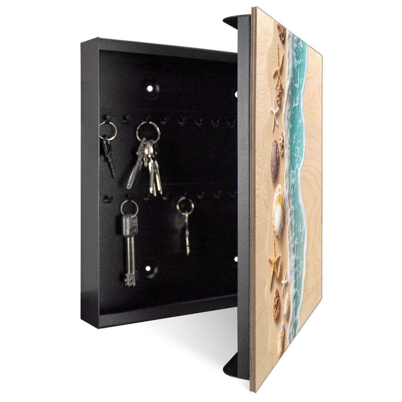 Bringe Ordnung und Eleganz in deinen Eingangsbereich mit dem banjado Schlüsselkasten Motiv Motiv Strandparadies. Die moderne Schlüsselbox kombiniert funktionales Design mit hochwertiger Verarbeitung und wird so zu einem echten Hingucker in Flur, Büro oder Ferienwohnung. ✅ Stilvolle Schlüsselaufbewahrung mit moderner Holzfront im Motiv Motiv Strandparadies Der Design-Schlüsselkasten Motiv Motiv Strandparadies bietet Platz für bis zu 50 Schlüssel, die auf 5 stabilen Reihen mit je 10 Haken übersichtlich verstaut werden. Mit seinen kompakten Maßen von 30 x 30 x 5 cm passt die Schlüsselbox perfekt auch in kleinere Räume. Der schwarz lackierte Korpus mit dem Scharnier auf der rechten Seite harmoniert mit der bedruckten Holzfront und fügt sich nahtlos in jedes Wohnambiente ein. Ob als Schlüsselorganizer für Zuhause oder als praktische Lösung für Büros, Praxen und Gewerbe - der banjado Schlüsselkasten sorgt für Ordnung und Übersicht. Durch die klare Strukturierung der Haken lassen sich auch viele Schlüssel problemlos verwalten. Die Schlüsselbox Motiv Motiv Strandparadies zur Wandmontage wird inklusive Befestigungsmaterial geliefert und ist schnell angebracht. So hast du deine Schlüssel jederzeit griffbereit und zugleich stilvoll verstaut. Mit diesem banjado Schlüsselkasten Motiv Motiv Strandparadies kombinierst du praktische Aufbewahrung mit stilvollem Wohndesign. Ob privat oder geschäftlich - die Schlüsselbox sorgt für mehr Ordnung, Übersicht und ein wohnliches Ambiente.Vorteile im Überblick
