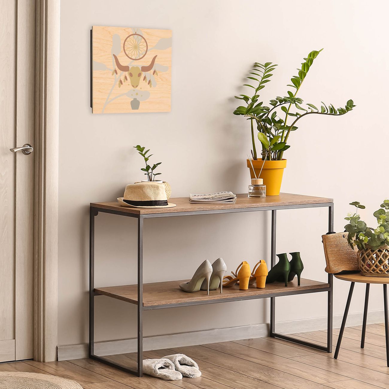 Bringe Ordnung und Eleganz in deinen Eingangsbereich mit dem banjado Schlüsselkasten Motiv Motiv Traumfänger Mond und Federn. Die moderne Schlüsselbox kombiniert funktionales Design mit hochwertiger Verarbeitung und wird so zu einem echten Hingucker in Flur, Büro oder Ferienwohnung. ✅ Stilvolle Schlüsselaufbewahrung mit moderner Holzfront im Motiv Motiv Traumfänger Mond und Federn Der Design-Schlüsselkasten Motiv Motiv Traumfänger Mond und Federn bietet Platz für bis zu 50 Schlüssel, die auf 5 stabilen Reihen mit je 10 Haken übersichtlich verstaut werden. Mit seinen kompakten Maßen von 30 x 30 x 5 cm passt die Schlüsselbox perfekt auch in kleinere Räume. Der schwarz lackierte Korpus mit dem Scharnier auf der linken Seite harmoniert mit der bedruckten Holzfront und fügt sich nahtlos in jedes Wohnambiente ein. Ob als Schlüsselorganizer für Zuhause oder als praktische Lösung für Büros, Praxen und Gewerbe - der banjado Schlüsselkasten sorgt für Ordnung und Übersicht. Durch die klare Strukturierung der Haken lassen sich auch viele Schlüssel problemlos verwalten. Die Schlüsselbox Motiv Motiv Traumfänger Mond und Federn zur Wandmontage wird inklusive Befestigungsmaterial geliefert und ist schnell angebracht. So hast du deine Schlüssel jederzeit griffbereit und zugleich stilvoll verstaut. Mit diesem banjado Schlüsselkasten Motiv Motiv Traumfänger Mond und Federn kombinierst du praktische Aufbewahrung mit stilvollem Wohndesign. Ob privat oder geschäftlich - die Schlüsselbox sorgt für mehr Ordnung, Übersicht und ein wohnliches Ambiente.Vorteile im Überblick