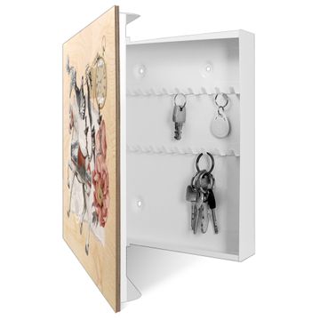 Bringe Ordnung und Eleganz in deinen Eingangsbereich mit dem banjado Schlüsselkasten Motiv Motiv Zeitreise-Kollage. Die moderne Schlüsselbox kombiniert funktionales Design mit hochwertiger Verarbeitung und wird so zu einem echten Hingucker in Flur, Büro oder Ferienwohnung. ✅ Stilvolle Schlüsselaufbewahrung mit moderner Holzfront im Motiv Motiv Zeitreise-Kollage Der Design-Schlüsselkasten Motiv Motiv Zeitreise-Kollage bietet Platz für bis zu 50 Schlüssel, die auf 5 stabilen Reihen mit je 10 Haken übersichtlich verstaut werden. Mit seinen kompakten Maßen von 30 x 30 x 5 cm passt die Schlüsselbox perfekt auch in kleinere Räume. Der weiß lackierte Korpus mit dem Scharnier auf der linken Seite harmoniert mit der bedruckten Holzfront und fügt sich nahtlos in jedes Wohnambiente ein. Ob als Schlüsselorganizer für Zuhause oder als praktische Lösung für Büros, Praxen und Gewerbe - der banjado Schlüsselkasten sorgt für Ordnung und Übersicht. Durch die klare Strukturierung der Haken lassen sich auch viele Schlüssel problemlos verwalten. Die Schlüsselbox Motiv Motiv Zeitreise-Kollage zur Wandmontage wird inklusive Befestigungsmaterial geliefert und ist schnell angebracht. So hast du deine Schlüssel jederzeit griffbereit und zugleich stilvoll verstaut. Mit diesem banjado Schlüsselkasten Motiv Motiv Zeitreise-Kollage kombinierst du praktische Aufbewahrung mit stilvollem Wohndesign. Ob privat oder geschäftlich - die Schlüsselbox sorgt für mehr Ordnung, Übersicht und ein wohnliches Ambiente.Vorteile im Überblick