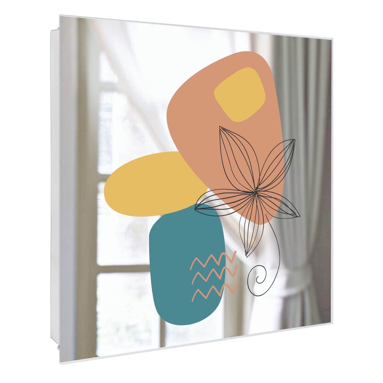 Bringe Ordnung und Stil in deinen Eingangsbereich mit dem banjado Schlüsselkasten mit Spiegel. Die elegante Spiegelfront kombiniert Funktionalität mit modernem Design und macht die Schlüsselaufbewahrung zu einem dekorativen Highlight. ✅ Spiegel Schlüsselaufbewahrung mit Motiv Motiv Abstrakte Blumenkontur Der Design-Schlüsselkasten Motiv Motiv Abstrakte Blumenkontur bietet Platz für bis zu 50 Schlüssel, die auf 5 stabilen Reihen mit je 10 Haken übersichtlich verstaut werden. Mit seinen kompakten Maßen von 30 x 30 x 5 cm passt die Schlüsselbox perfekt auch in kleinere Räume. Der weiß lackierte Stahlkorpus mit rechts angeschlagenem Türscharnier harmoniert mit der Spiegelfront und fügt sich nahtlos in jedes Wohnambiente ein. Ob als Schlüsselorganizer für Zuhause oder als praktische Lösung für Büros, Praxen und Gewerbe, der banjado Schlüsselkasten sorgt für Ordnung und Übersicht. Die Spiegelfront verleiht dem Eingangsbereich zusätzliche Funktionalität und lässt Räume optisch größer wirken. Die Schlüsselbox Motiv Motiv Abstrakte Blumenkontur zur Wandmontage wird inklusive Befestigungsmaterial geliefert und ist schnell angebracht. So hast du deine Schlüssel jederzeit griffbereit und zugleich stilvoll verstaut. Mit diesem banjado Schlüsselkasten Motiv Motiv Abstrakte Blumenkontur kombinierst du praktische Aufbewahrung mit stilvollem Wohndesign. Ob privat oder geschäftlich, die Schlüsselbox sorgt für mehr Ordnung, Übersicht und ein wohnliches Ambiente.Vorteile im Überblick