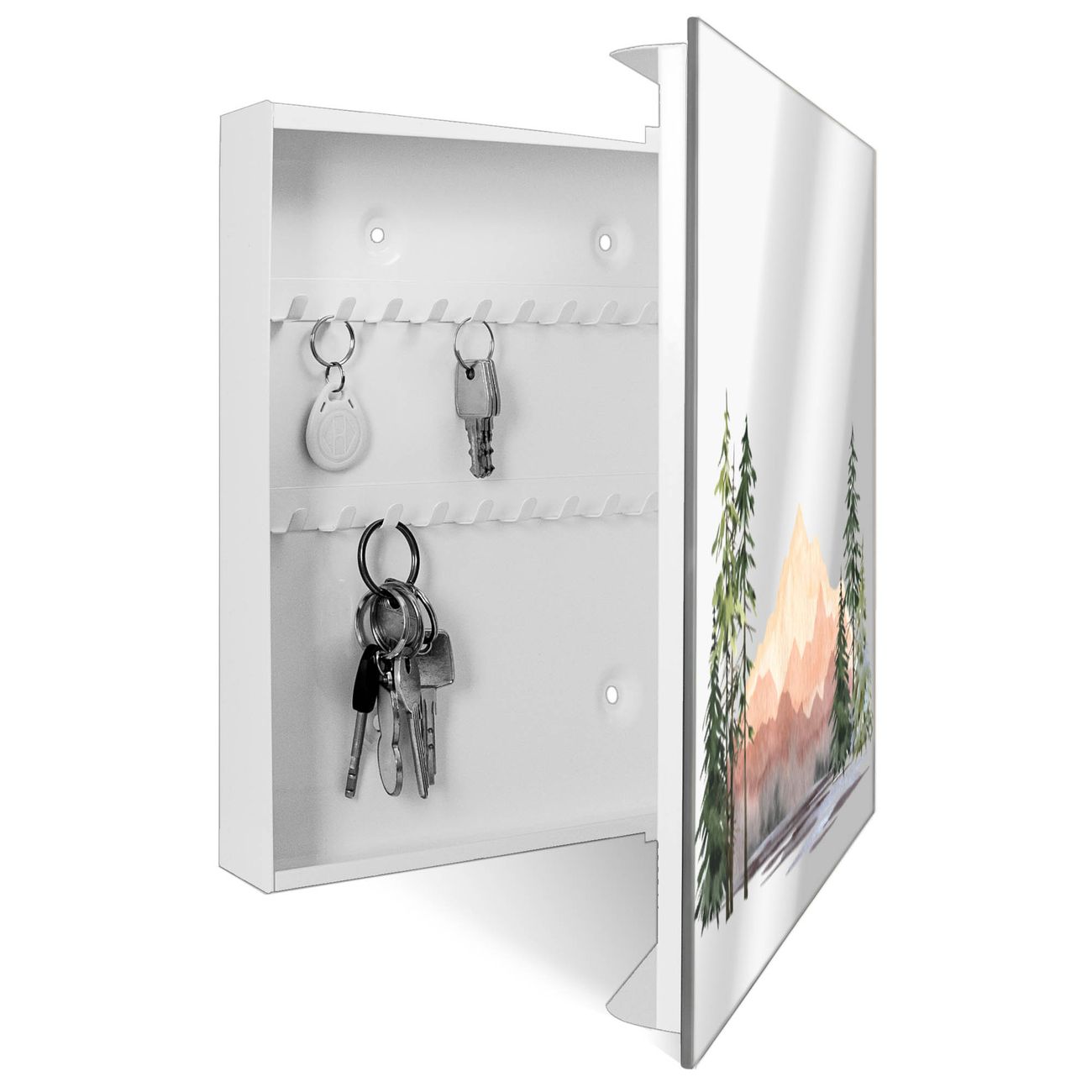 Bringe Ordnung und Stil in deinen Eingangsbereich mit dem banjado Schlüsselkasten mit Spiegel. Die elegante Spiegelfront kombiniert Funktionalität mit modernem Design und macht die Schlüsselaufbewahrung zu einem dekorativen Highlight. ✅ Spiegel Schlüsselaufbewahrung mit Motiv Motiv Alpenpanorama Der Design-Schlüsselkasten Motiv Motiv Alpenpanorama bietet Platz für bis zu 50 Schlüssel, die auf 5 stabilen Reihen mit je 10 Haken übersichtlich verstaut werden. Mit seinen kompakten Maßen von 30 x 30 x 5 cm passt die Schlüsselbox perfekt auch in kleinere Räume. Der weiß lackierte Stahlkorpus mit rechts angeschlagenem Türscharnier harmoniert mit der Spiegelfront und fügt sich nahtlos in jedes Wohnambiente ein. Ob als Schlüsselorganizer für Zuhause oder als praktische Lösung für Büros, Praxen und Gewerbe, der banjado Schlüsselkasten sorgt für Ordnung und Übersicht. Die Spiegelfront verleiht dem Eingangsbereich zusätzliche Funktionalität und lässt Räume optisch größer wirken. Die Schlüsselbox Motiv Motiv Alpenpanorama zur Wandmontage wird inklusive Befestigungsmaterial geliefert und ist schnell angebracht. So hast du deine Schlüssel jederzeit griffbereit und zugleich stilvoll verstaut. Mit diesem banjado Schlüsselkasten Motiv Motiv Alpenpanorama kombinierst du praktische Aufbewahrung mit stilvollem Wohndesign. Ob privat oder geschäftlich, die Schlüsselbox sorgt für mehr Ordnung, Übersicht und ein wohnliches Ambiente.Vorteile im Überblick