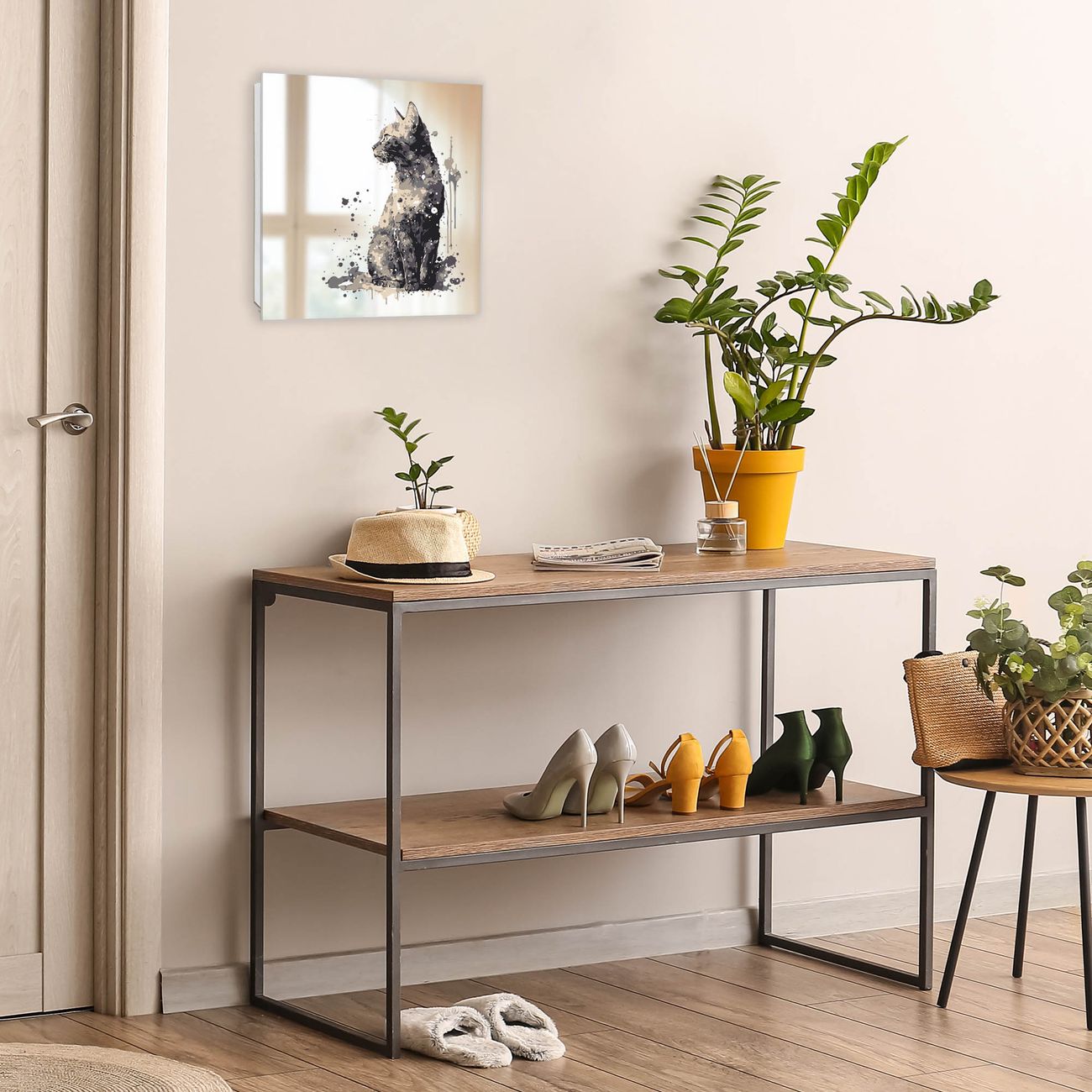 Bringe Ordnung und Stil in deinen Eingangsbereich mit dem banjado Schlüsselkasten mit Spiegel. Die elegante Spiegelfront kombiniert Funktionalität mit modernem Design und macht die Schlüsselaufbewahrung zu einem dekorativen Highlight. ✅ Spiegel Schlüsselaufbewahrung mit Motiv Motiv Aquarellkatze 2 Der Design-Schlüsselkasten Motiv Motiv Aquarellkatze 2 bietet Platz für bis zu 50 Schlüssel, die auf 5 stabilen Reihen mit je 10 Haken übersichtlich verstaut werden. Mit seinen kompakten Maßen von 30 x 30 x 5 cm passt die Schlüsselbox perfekt auch in kleinere Räume. Der weiß lackierte Stahlkorpus mit rechts angeschlagenem Türscharnier harmoniert mit der Spiegelfront und fügt sich nahtlos in jedes Wohnambiente ein. Ob als Schlüsselorganizer für Zuhause oder als praktische Lösung für Büros, Praxen und Gewerbe, der banjado Schlüsselkasten sorgt für Ordnung und Übersicht. Die Spiegelfront verleiht dem Eingangsbereich zusätzliche Funktionalität und lässt Räume optisch größer wirken. Die Schlüsselbox Motiv Motiv Aquarellkatze 2 zur Wandmontage wird inklusive Befestigungsmaterial geliefert und ist schnell angebracht. So hast du deine Schlüssel jederzeit griffbereit und zugleich stilvoll verstaut. Mit diesem banjado Schlüsselkasten Motiv Motiv Aquarellkatze 2 kombinierst du praktische Aufbewahrung mit stilvollem Wohndesign. Ob privat oder geschäftlich, die Schlüsselbox sorgt für mehr Ordnung, Übersicht und ein wohnliches Ambiente.Vorteile im Überblick
