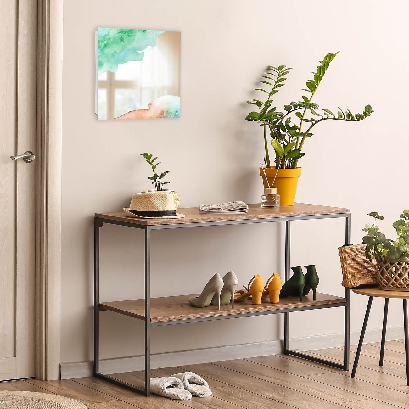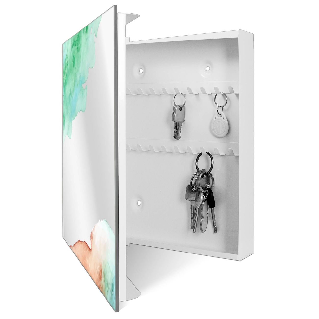 Bringe Ordnung und Stil in deinen Eingangsbereich mit dem banjado Schlüsselkasten mit Spiegel. Die elegante Spiegelfront kombiniert Funktionalität mit modernem Design und macht die Schlüsselaufbewahrung zu einem dekorativen Highlight. ✅ Spiegel Schlüsselaufbewahrung mit Motiv Motiv Aquarellzauber Der Design-Schlüsselkasten Motiv Motiv Aquarellzauber bietet Platz für bis zu 50 Schlüssel, die auf 5 stabilen Reihen mit je 10 Haken übersichtlich verstaut werden. Mit seinen kompakten Maßen von 30 x 30 x 5 cm passt die Schlüsselbox perfekt auch in kleinere Räume. Der weiß lackierte Stahlkorpus mit rechts angeschlagenem Türscharnier harmoniert mit der Spiegelfront und fügt sich nahtlos in jedes Wohnambiente ein. Ob als Schlüsselorganizer für Zuhause oder als praktische Lösung für Büros, Praxen und Gewerbe, der banjado Schlüsselkasten sorgt für Ordnung und Übersicht. Die Spiegelfront verleiht dem Eingangsbereich zusätzliche Funktionalität und lässt Räume optisch größer wirken. Die Schlüsselbox Motiv Motiv Aquarellzauber zur Wandmontage wird inklusive Befestigungsmaterial geliefert und ist schnell angebracht. So hast du deine Schlüssel jederzeit griffbereit und zugleich stilvoll verstaut. Mit diesem banjado Schlüsselkasten Motiv Motiv Aquarellzauber kombinierst du praktische Aufbewahrung mit stilvollem Wohndesign. Ob privat oder geschäftlich, die Schlüsselbox sorgt für mehr Ordnung, Übersicht und ein wohnliches Ambiente.Vorteile im Überblick