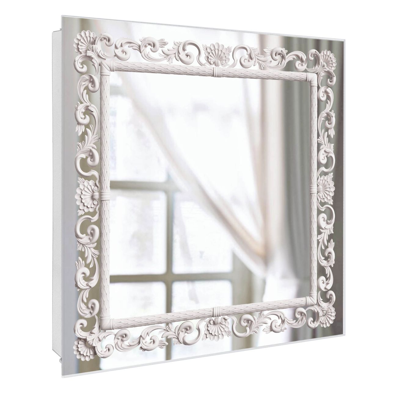 Bringe Ordnung und Stil in deinen Eingangsbereich mit dem banjado Schlüsselkasten mit Spiegel. Die elegante Spiegelfront kombiniert Funktionalität mit modernem Design und macht die Schlüsselaufbewahrung zu einem dekorativen Highlight. ✅ Spiegel Schlüsselaufbewahrung mit Motiv Motiv Barocker Bilderrahmen Der Design-Schlüsselkasten Motiv Motiv Barocker Bilderrahmen bietet Platz für bis zu 50 Schlüssel, die auf 5 stabilen Reihen mit je 10 Haken übersichtlich verstaut werden. Mit seinen kompakten Maßen von 30 x 30 x 5 cm passt die Schlüsselbox perfekt auch in kleinere Räume. Der weiß lackierte Stahlkorpus mit rechts angeschlagenem Türscharnier harmoniert mit der Spiegelfront und fügt sich nahtlos in jedes Wohnambiente ein. Ob als Schlüsselorganizer für Zuhause oder als praktische Lösung für Büros, Praxen und Gewerbe, der banjado Schlüsselkasten sorgt für Ordnung und Übersicht. Die Spiegelfront verleiht dem Eingangsbereich zusätzliche Funktionalität und lässt Räume optisch größer wirken. Die Schlüsselbox Motiv Motiv Barocker Bilderrahmen zur Wandmontage wird inklusive Befestigungsmaterial geliefert und ist schnell angebracht. So hast du deine Schlüssel jederzeit griffbereit und zugleich stilvoll verstaut. Mit diesem banjado Schlüsselkasten Motiv Motiv Barocker Bilderrahmen kombinierst du praktische Aufbewahrung mit stilvollem Wohndesign. Ob privat oder geschäftlich, die Schlüsselbox sorgt für mehr Ordnung, Übersicht und ein wohnliches Ambiente.Vorteile im Überblick