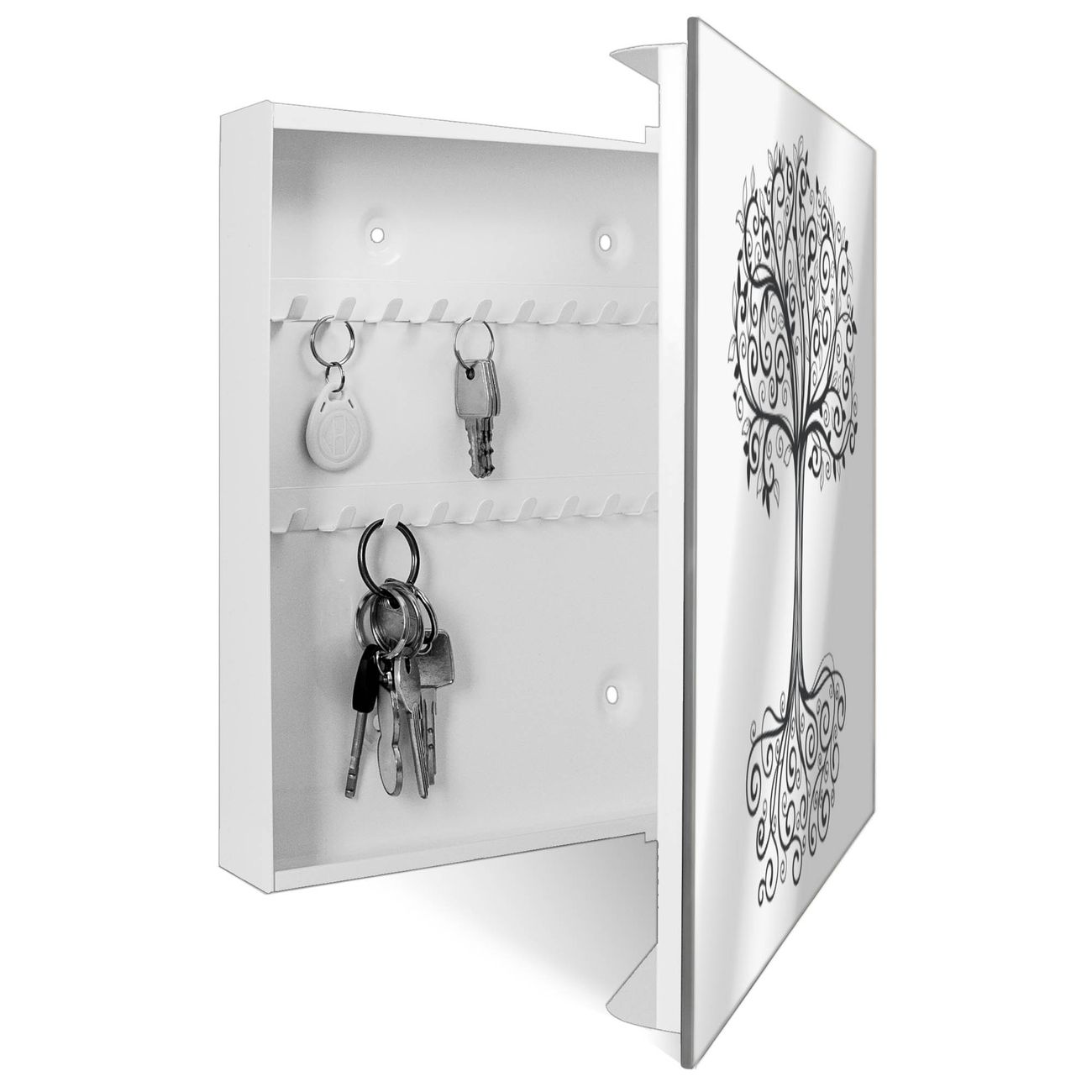 Bringe Ordnung und Stil in deinen Eingangsbereich mit dem banjado Schlüsselkasten mit Spiegel. Die elegante Spiegelfront kombiniert Funktionalität mit modernem Design und macht die Schlüsselaufbewahrung zu einem dekorativen Highlight. ✅ Spiegel Schlüsselaufbewahrung mit Motiv Motiv Baum des Lebens Der Design-Schlüsselkasten Motiv Motiv Baum des Lebens bietet Platz für bis zu 50 Schlüssel, die auf 5 stabilen Reihen mit je 10 Haken übersichtlich verstaut werden. Mit seinen kompakten Maßen von 30 x 30 x 5 cm passt die Schlüsselbox perfekt auch in kleinere Räume. Der weiß lackierte Stahlkorpus mit rechts angeschlagenem Türscharnier harmoniert mit der Spiegelfront und fügt sich nahtlos in jedes Wohnambiente ein. Ob als Schlüsselorganizer für Zuhause oder als praktische Lösung für Büros, Praxen und Gewerbe, der banjado Schlüsselkasten sorgt für Ordnung und Übersicht. Die Spiegelfront verleiht dem Eingangsbereich zusätzliche Funktionalität und lässt Räume optisch größer wirken. Die Schlüsselbox Motiv Motiv Baum des Lebens zur Wandmontage wird inklusive Befestigungsmaterial geliefert und ist schnell angebracht. So hast du deine Schlüssel jederzeit griffbereit und zugleich stilvoll verstaut. Mit diesem banjado Schlüsselkasten Motiv Motiv Baum des Lebens kombinierst du praktische Aufbewahrung mit stilvollem Wohndesign. Ob privat oder geschäftlich, die Schlüsselbox sorgt für mehr Ordnung, Übersicht und ein wohnliches Ambiente.Vorteile im Überblick