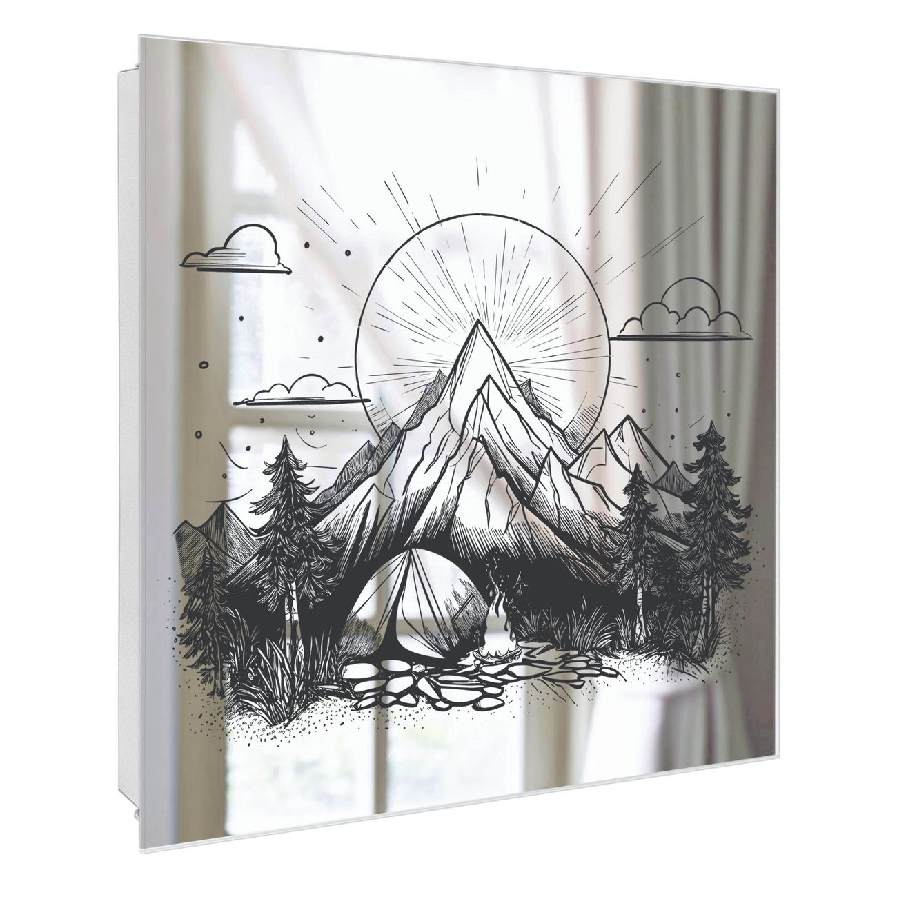 Bringe Ordnung und Stil in deinen Eingangsbereich mit dem banjado Schlüsselkasten mit Spiegel. Die elegante Spiegelfront kombiniert Funktionalität mit modernem Design und macht die Schlüsselaufbewahrung zu einem dekorativen Highlight. ✅ Spiegel Schlüsselaufbewahrung mit Motiv Motiv Bergcamping Abenteuer 2 Der Design-Schlüsselkasten Motiv Motiv Bergcamping Abenteuer 2 bietet Platz für bis zu 50 Schlüssel, die auf 5 stabilen Reihen mit je 10 Haken übersichtlich verstaut werden. Mit seinen kompakten Maßen von 30 x 30 x 5 cm passt die Schlüsselbox perfekt auch in kleinere Räume. Der weiß lackierte Stahlkorpus mit rechts angeschlagenem Türscharnier harmoniert mit der Spiegelfront und fügt sich nahtlos in jedes Wohnambiente ein. Ob als Schlüsselorganizer für Zuhause oder als praktische Lösung für Büros, Praxen und Gewerbe, der banjado Schlüsselkasten sorgt für Ordnung und Übersicht. Die Spiegelfront verleiht dem Eingangsbereich zusätzliche Funktionalität und lässt Räume optisch größer wirken. Die Schlüsselbox Motiv Motiv Bergcamping Abenteuer 2 zur Wandmontage wird inklusive Befestigungsmaterial geliefert und ist schnell angebracht. So hast du deine Schlüssel jederzeit griffbereit und zugleich stilvoll verstaut. Mit diesem banjado Schlüsselkasten Motiv Motiv Bergcamping Abenteuer 2 kombinierst du praktische Aufbewahrung mit stilvollem Wohndesign. Ob privat oder geschäftlich, die Schlüsselbox sorgt für mehr Ordnung, Übersicht und ein wohnliches Ambiente.Vorteile im Überblick