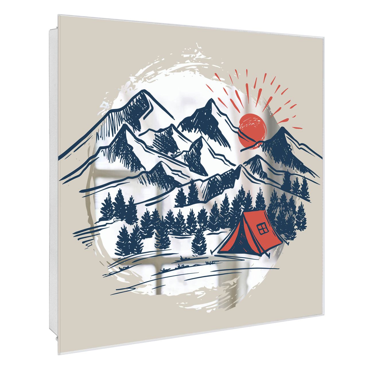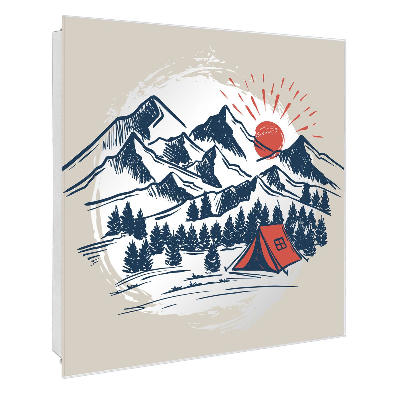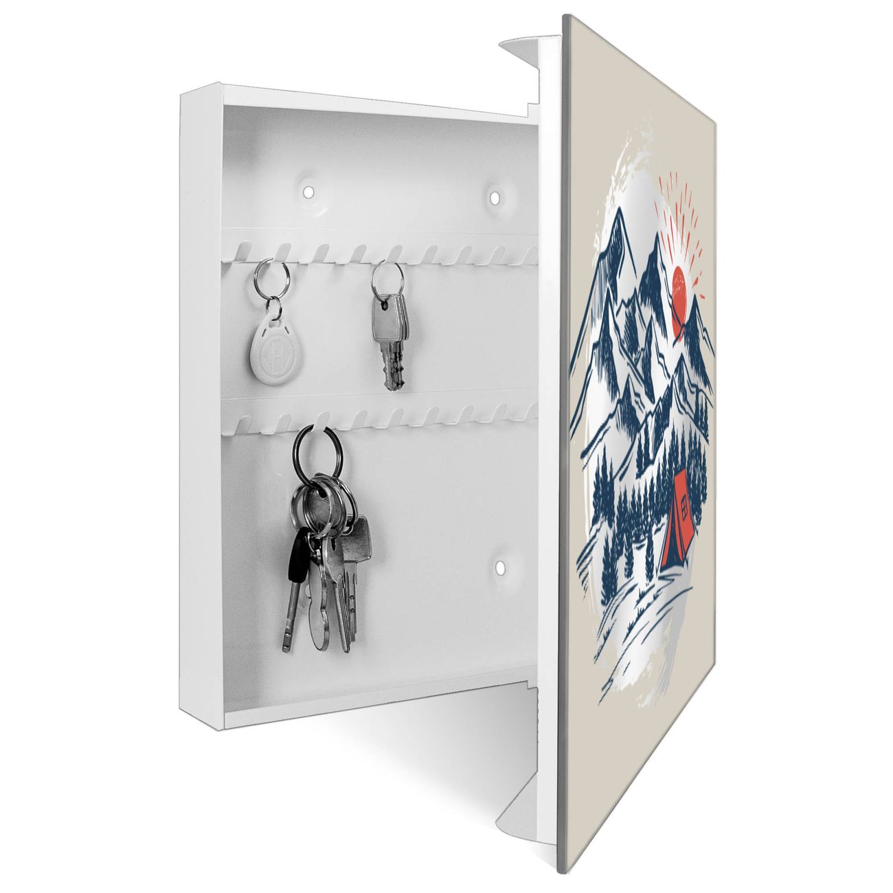 Bringe Ordnung und Stil in deinen Eingangsbereich mit dem banjado Schlüsselkasten mit Spiegel. Die elegante Spiegelfront kombiniert Funktionalität mit modernem Design und macht die Schlüsselaufbewahrung zu einem dekorativen Highlight. ✅ Spiegel Schlüsselaufbewahrung mit Motiv Motiv Bergcamping Abenteuer Der Design-Schlüsselkasten Motiv Motiv Bergcamping Abenteuer bietet Platz für bis zu 50 Schlüssel, die auf 5 stabilen Reihen mit je 10 Haken übersichtlich verstaut werden. Mit seinen kompakten Maßen von 30 x 30 x 5 cm passt die Schlüsselbox perfekt auch in kleinere Räume. Der weiß lackierte Stahlkorpus mit rechts angeschlagenem Türscharnier harmoniert mit der Spiegelfront und fügt sich nahtlos in jedes Wohnambiente ein. Ob als Schlüsselorganizer für Zuhause oder als praktische Lösung für Büros, Praxen und Gewerbe, der banjado Schlüsselkasten sorgt für Ordnung und Übersicht. Die Spiegelfront verleiht dem Eingangsbereich zusätzliche Funktionalität und lässt Räume optisch größer wirken. Die Schlüsselbox Motiv Motiv Bergcamping Abenteuer zur Wandmontage wird inklusive Befestigungsmaterial geliefert und ist schnell angebracht. So hast du deine Schlüssel jederzeit griffbereit und zugleich stilvoll verstaut. Mit diesem banjado Schlüsselkasten Motiv Motiv Bergcamping Abenteuer kombinierst du praktische Aufbewahrung mit stilvollem Wohndesign. Ob privat oder geschäftlich, die Schlüsselbox sorgt für mehr Ordnung, Übersicht und ein wohnliches Ambiente.Vorteile im Überblick