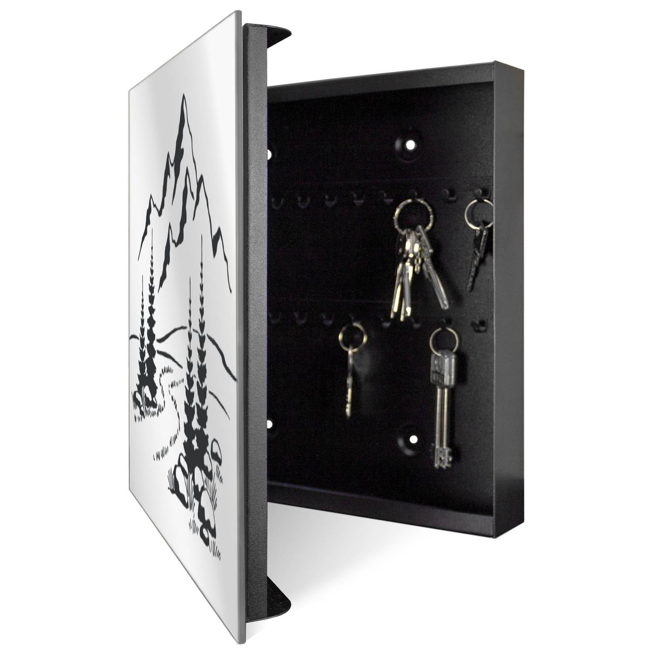 Bringe Ordnung und Stil in deinen Eingangsbereich mit dem banjado Schlüsselkasten mit Spiegel. Die elegante Spiegelfront kombiniert Funktionalität mit modernem Design und macht die Schlüsselaufbewahrung zu einem dekorativen Highlight. ✅ Spiegel Schlüsselaufbewahrung mit Motiv Motiv Berglandschaft Der Design-Schlüsselkasten Motiv Motiv Berglandschaft bietet Platz für bis zu 50 Schlüssel, die auf 5 stabilen Reihen mit je 10 Haken übersichtlich verstaut werden. Mit seinen kompakten Maßen von 30 x 30 x 5 cm passt die Schlüsselbox perfekt auch in kleinere Räume. Der schwarz lackierte Stahlkorpus mit rechts angeschlagenem Türscharnier harmoniert mit der Spiegelfront und fügt sich nahtlos in jedes Wohnambiente ein. Ob als Schlüsselorganizer für Zuhause oder als praktische Lösung für Büros, Praxen und Gewerbe, der banjado Schlüsselkasten sorgt für Ordnung und Übersicht. Die Spiegelfront verleiht dem Eingangsbereich zusätzliche Funktionalität und lässt Räume optisch größer wirken. Die Schlüsselbox Motiv Motiv Berglandschaft zur Wandmontage wird inklusive Befestigungsmaterial geliefert und ist schnell angebracht. So hast du deine Schlüssel jederzeit griffbereit und zugleich stilvoll verstaut. Mit diesem banjado Schlüsselkasten Motiv Motiv Berglandschaft kombinierst du praktische Aufbewahrung mit stilvollem Wohndesign. Ob privat oder geschäftlich, die Schlüsselbox sorgt für mehr Ordnung, Übersicht und ein wohnliches Ambiente.Vorteile im Überblick