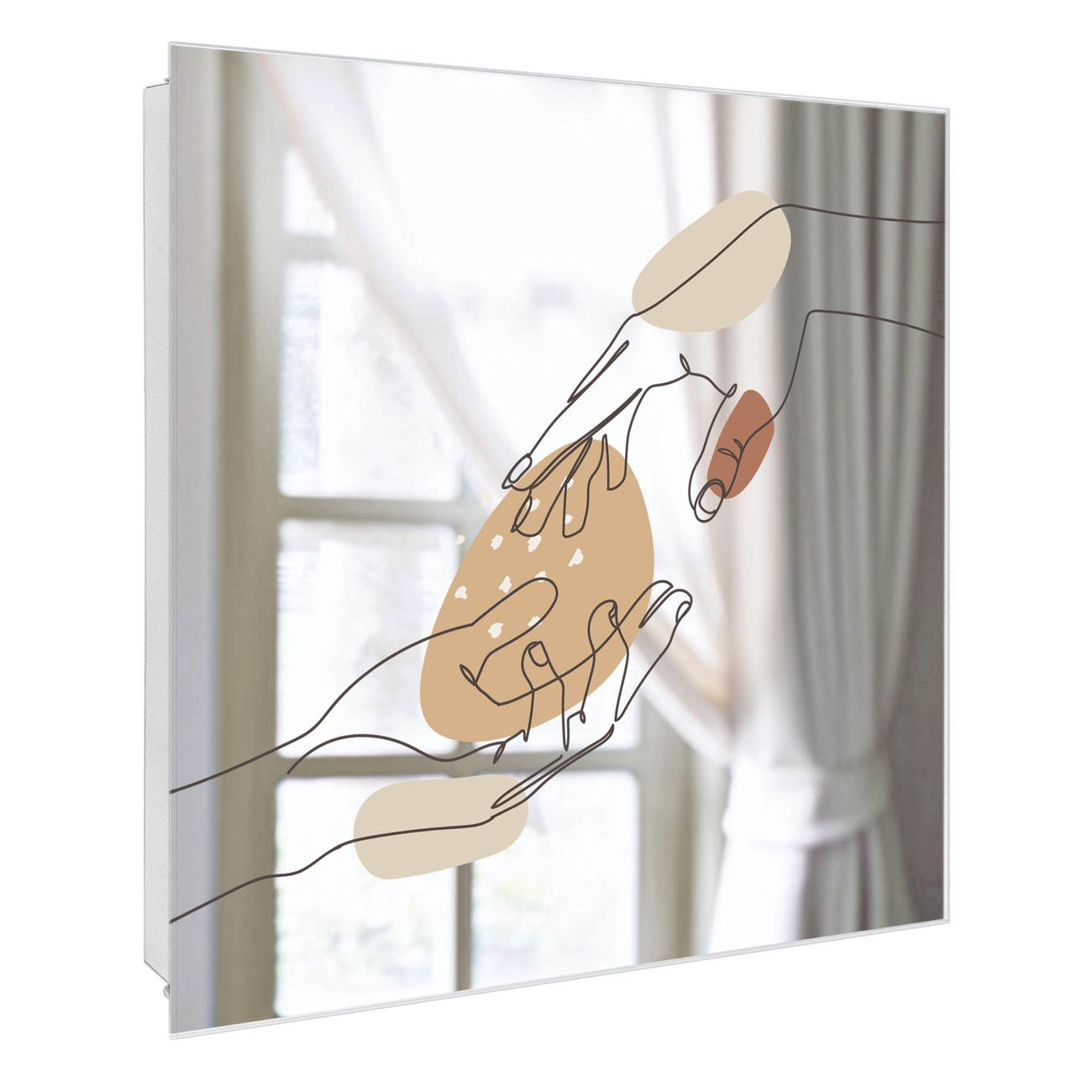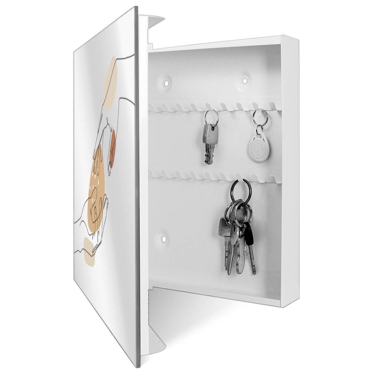 Bringe Ordnung und Stil in deinen Eingangsbereich mit dem banjado Schlüsselkasten mit Spiegel. Die elegante Spiegelfront kombiniert Funktionalität mit modernem Design und macht die Schlüsselaufbewahrung zu einem dekorativen Highlight. ✅ Spiegel Schlüsselaufbewahrung mit Motiv Motiv Berührende Verbindung Der Design-Schlüsselkasten Motiv Motiv Berührende Verbindung bietet Platz für bis zu 50 Schlüssel, die auf 5 stabilen Reihen mit je 10 Haken übersichtlich verstaut werden. Mit seinen kompakten Maßen von 30 x 30 x 5 cm passt die Schlüsselbox perfekt auch in kleinere Räume. Der weiß lackierte Stahlkorpus mit rechts angeschlagenem Türscharnier harmoniert mit der Spiegelfront und fügt sich nahtlos in jedes Wohnambiente ein. Ob als Schlüsselorganizer für Zuhause oder als praktische Lösung für Büros, Praxen und Gewerbe, der banjado Schlüsselkasten sorgt für Ordnung und Übersicht. Die Spiegelfront verleiht dem Eingangsbereich zusätzliche Funktionalität und lässt Räume optisch größer wirken. Die Schlüsselbox Motiv Motiv Berührende Verbindung zur Wandmontage wird inklusive Befestigungsmaterial geliefert und ist schnell angebracht. So hast du deine Schlüssel jederzeit griffbereit und zugleich stilvoll verstaut. Mit diesem banjado Schlüsselkasten Motiv Motiv Berührende Verbindung kombinierst du praktische Aufbewahrung mit stilvollem Wohndesign. Ob privat oder geschäftlich, die Schlüsselbox sorgt für mehr Ordnung, Übersicht und ein wohnliches Ambiente.Vorteile im Überblick