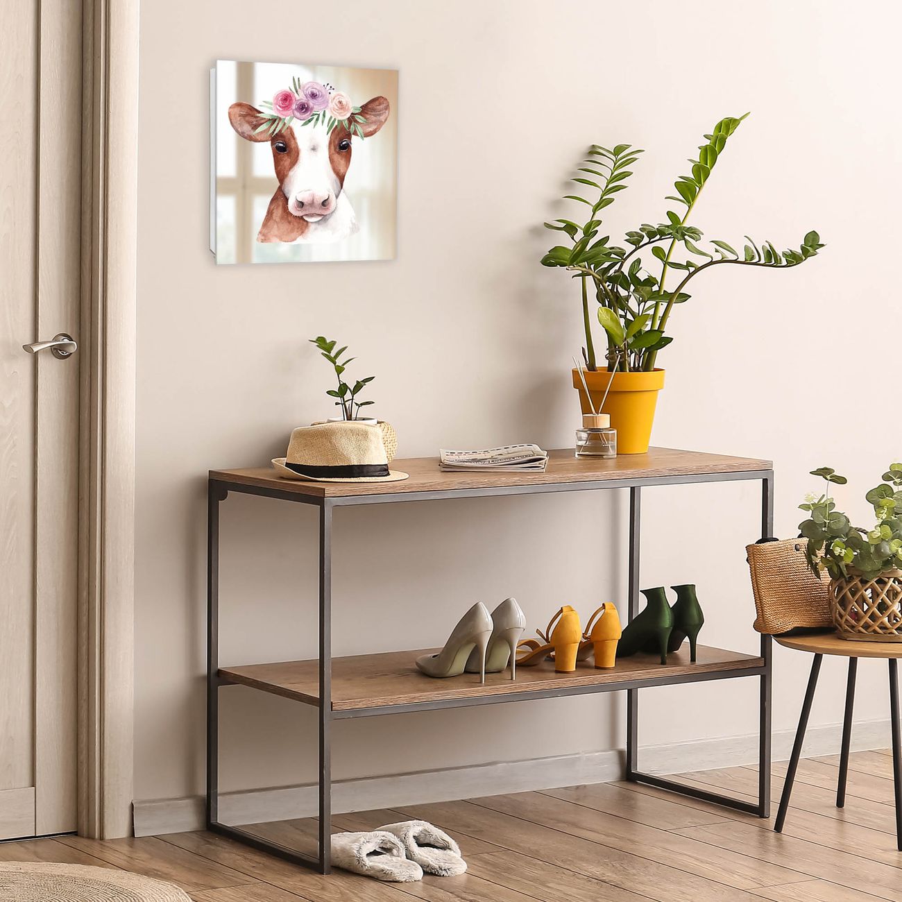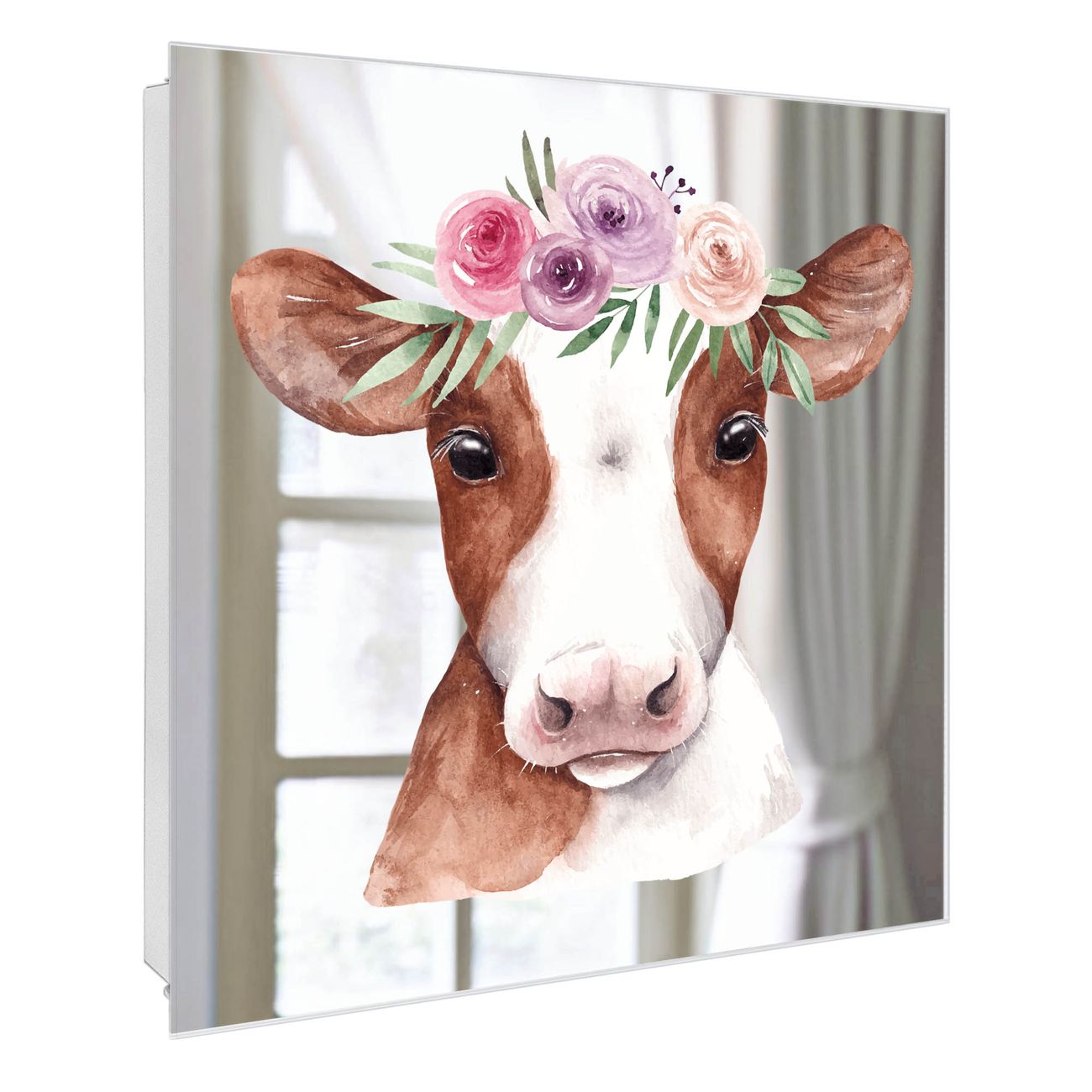 Bringe Ordnung und Stil in deinen Eingangsbereich mit dem banjado Schlüsselkasten mit Spiegel. Die elegante Spiegelfront kombiniert Funktionalität mit modernem Design und macht die Schlüsselaufbewahrung zu einem dekorativen Highlight. ✅ Spiegel Schlüsselaufbewahrung mit Motiv Motiv Blumenkronen-Kuh Der Design-Schlüsselkasten Motiv Motiv Blumenkronen-Kuh bietet Platz für bis zu 50 Schlüssel, die auf 5 stabilen Reihen mit je 10 Haken übersichtlich verstaut werden. Mit seinen kompakten Maßen von 30 x 30 x 5 cm passt die Schlüsselbox perfekt auch in kleinere Räume. Der weiß lackierte Stahlkorpus mit rechts angeschlagenem Türscharnier harmoniert mit der Spiegelfront und fügt sich nahtlos in jedes Wohnambiente ein. Ob als Schlüsselorganizer für Zuhause oder als praktische Lösung für Büros, Praxen und Gewerbe, der banjado Schlüsselkasten sorgt für Ordnung und Übersicht. Die Spiegelfront verleiht dem Eingangsbereich zusätzliche Funktionalität und lässt Räume optisch größer wirken. Die Schlüsselbox Motiv Motiv Blumenkronen-Kuh zur Wandmontage wird inklusive Befestigungsmaterial geliefert und ist schnell angebracht. So hast du deine Schlüssel jederzeit griffbereit und zugleich stilvoll verstaut. Mit diesem banjado Schlüsselkasten Motiv Motiv Blumenkronen-Kuh kombinierst du praktische Aufbewahrung mit stilvollem Wohndesign. Ob privat oder geschäftlich, die Schlüsselbox sorgt für mehr Ordnung, Übersicht und ein wohnliches Ambiente.Vorteile im Überblick