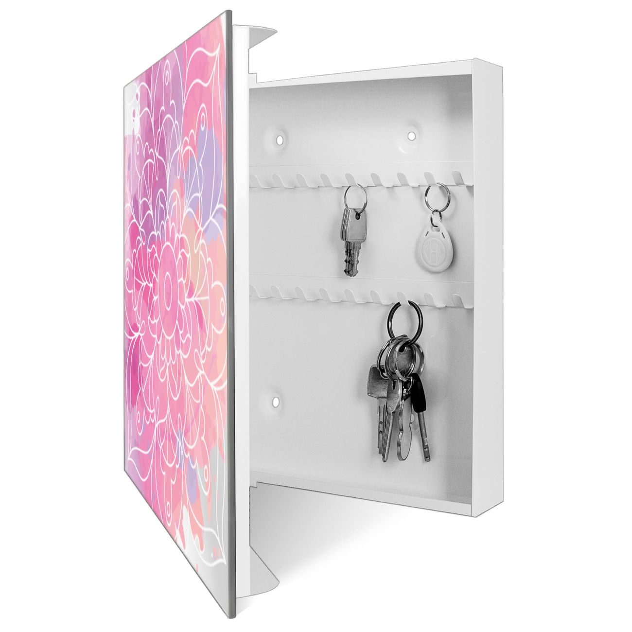 Bringe Ordnung und Stil in deinen Eingangsbereich mit dem banjado Schlüsselkasten mit Spiegel. Die elegante Spiegelfront kombiniert Funktionalität mit modernem Design und macht die Schlüsselaufbewahrung zu einem dekorativen Highlight. ✅ Spiegel Schlüsselaufbewahrung mit Motiv Motiv Blumenmandala Der Design-Schlüsselkasten Motiv Motiv Blumenmandala bietet Platz für bis zu 50 Schlüssel, die auf 5 stabilen Reihen mit je 10 Haken übersichtlich verstaut werden. Mit seinen kompakten Maßen von 30 x 30 x 5 cm passt die Schlüsselbox perfekt auch in kleinere Räume. Der weiß lackierte Stahlkorpus mit rechts angeschlagenem Türscharnier harmoniert mit der Spiegelfront und fügt sich nahtlos in jedes Wohnambiente ein. Ob als Schlüsselorganizer für Zuhause oder als praktische Lösung für Büros, Praxen und Gewerbe, der banjado Schlüsselkasten sorgt für Ordnung und Übersicht. Die Spiegelfront verleiht dem Eingangsbereich zusätzliche Funktionalität und lässt Räume optisch größer wirken. Die Schlüsselbox Motiv Motiv Blumenmandala zur Wandmontage wird inklusive Befestigungsmaterial geliefert und ist schnell angebracht. So hast du deine Schlüssel jederzeit griffbereit und zugleich stilvoll verstaut. Mit diesem banjado Schlüsselkasten Motiv Motiv Blumenmandala kombinierst du praktische Aufbewahrung mit stilvollem Wohndesign. Ob privat oder geschäftlich, die Schlüsselbox sorgt für mehr Ordnung, Übersicht und ein wohnliches Ambiente.Vorteile im Überblick