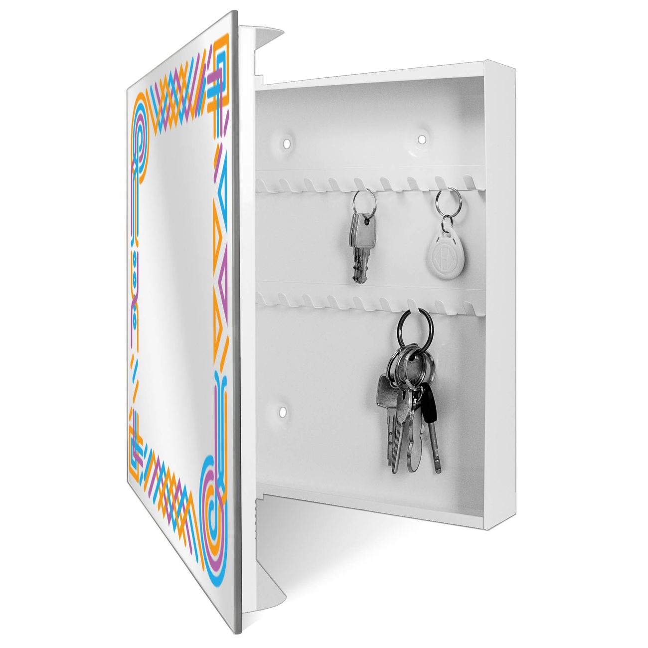 Bringe Ordnung und Stil in deinen Eingangsbereich mit dem banjado Schlüsselkasten mit Spiegel. Die elegante Spiegelfront kombiniert Funktionalität mit modernem Design und macht die Schlüsselaufbewahrung zu einem dekorativen Highlight. ✅ Spiegel Schlüsselaufbewahrung mit Motiv Motiv Bunte Eckverzierung Der Design-Schlüsselkasten Motiv Motiv Bunte Eckverzierung bietet Platz für bis zu 50 Schlüssel, die auf 5 stabilen Reihen mit je 10 Haken übersichtlich verstaut werden. Mit seinen kompakten Maßen von 30 x 30 x 5 cm passt die Schlüsselbox perfekt auch in kleinere Räume. Der weiß lackierte Stahlkorpus mit rechts angeschlagenem Türscharnier harmoniert mit der Spiegelfront und fügt sich nahtlos in jedes Wohnambiente ein. Ob als Schlüsselorganizer für Zuhause oder als praktische Lösung für Büros, Praxen und Gewerbe, der banjado Schlüsselkasten sorgt für Ordnung und Übersicht. Die Spiegelfront verleiht dem Eingangsbereich zusätzliche Funktionalität und lässt Räume optisch größer wirken. Die Schlüsselbox Motiv Motiv Bunte Eckverzierung zur Wandmontage wird inklusive Befestigungsmaterial geliefert und ist schnell angebracht. So hast du deine Schlüssel jederzeit griffbereit und zugleich stilvoll verstaut. Mit diesem banjado Schlüsselkasten Motiv Motiv Bunte Eckverzierung kombinierst du praktische Aufbewahrung mit stilvollem Wohndesign. Ob privat oder geschäftlich, die Schlüsselbox sorgt für mehr Ordnung, Übersicht und ein wohnliches Ambiente.Vorteile im Überblick