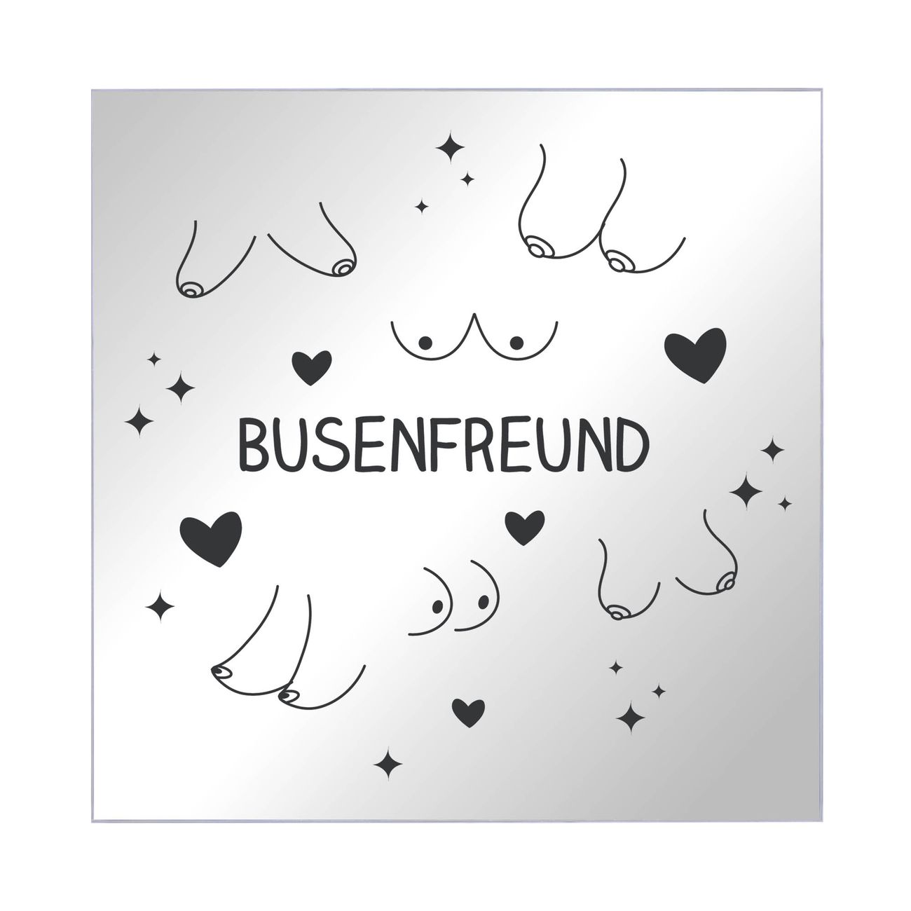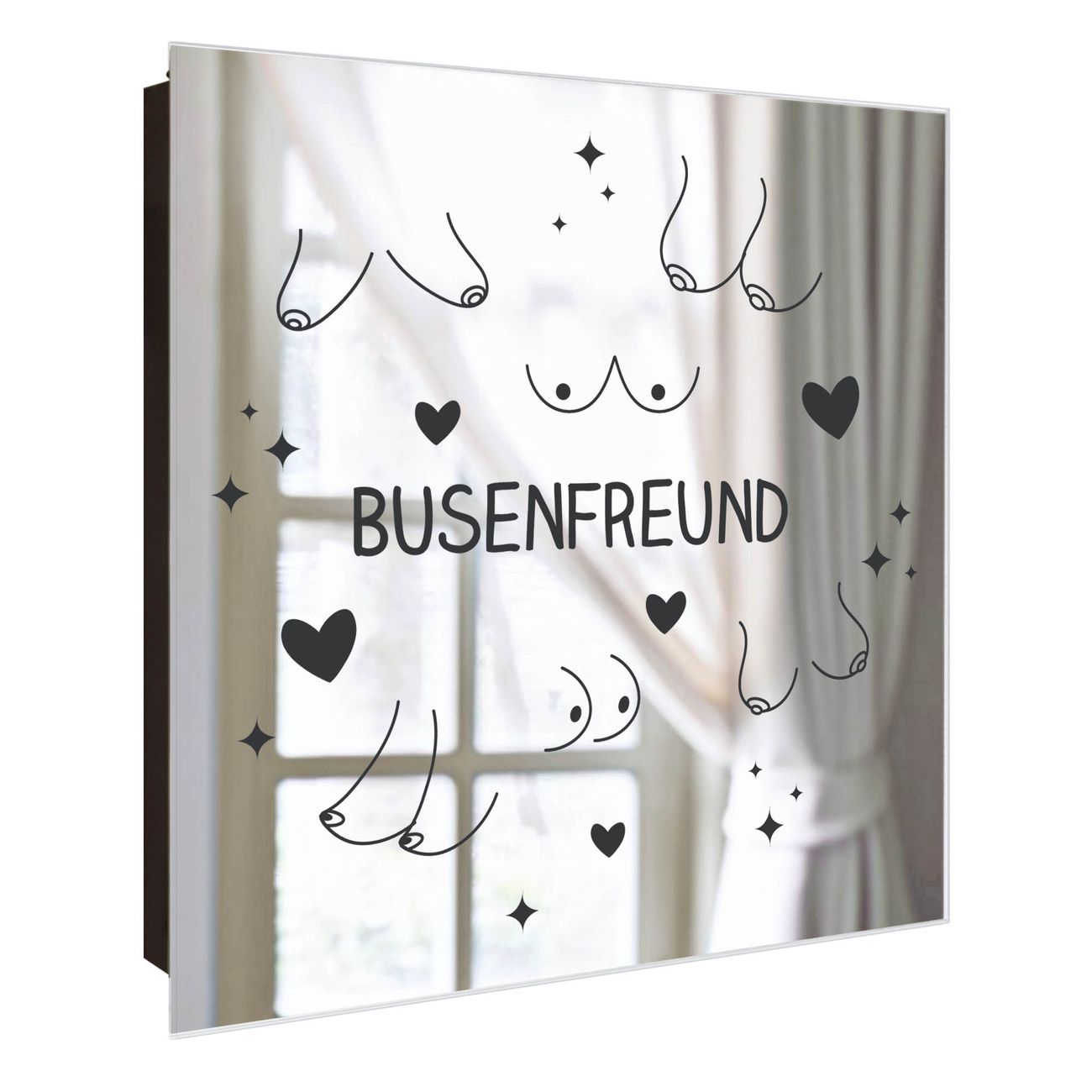 Bringe Ordnung und Stil in deinen Eingangsbereich mit dem banjado Schlüsselkasten mit Spiegel. Die elegante Spiegelfront kombiniert Funktionalität mit modernem Design und macht die Schlüsselaufbewahrung zu einem dekorativen Highlight. ✅ Spiegel Schlüsselaufbewahrung mit Motiv Motiv Busenfreund 2 Der Design-Schlüsselkasten Motiv Motiv Busenfreund 2 bietet Platz für bis zu 50 Schlüssel, die auf 5 stabilen Reihen mit je 10 Haken übersichtlich verstaut werden. Mit seinen kompakten Maßen von 30 x 30 x 5 cm passt die Schlüsselbox perfekt auch in kleinere Räume. Der schwarz lackierte Stahlkorpus mit rechts angeschlagenem Türscharnier harmoniert mit der Spiegelfront und fügt sich nahtlos in jedes Wohnambiente ein. Ob als Schlüsselorganizer für Zuhause oder als praktische Lösung für Büros, Praxen und Gewerbe, der banjado Schlüsselkasten sorgt für Ordnung und Übersicht. Die Spiegelfront verleiht dem Eingangsbereich zusätzliche Funktionalität und lässt Räume optisch größer wirken. Die Schlüsselbox Motiv Motiv Busenfreund 2 zur Wandmontage wird inklusive Befestigungsmaterial geliefert und ist schnell angebracht. So hast du deine Schlüssel jederzeit griffbereit und zugleich stilvoll verstaut. Mit diesem banjado Schlüsselkasten Motiv Motiv Busenfreund 2 kombinierst du praktische Aufbewahrung mit stilvollem Wohndesign. Ob privat oder geschäftlich, die Schlüsselbox sorgt für mehr Ordnung, Übersicht und ein wohnliches Ambiente.Vorteile im Überblick