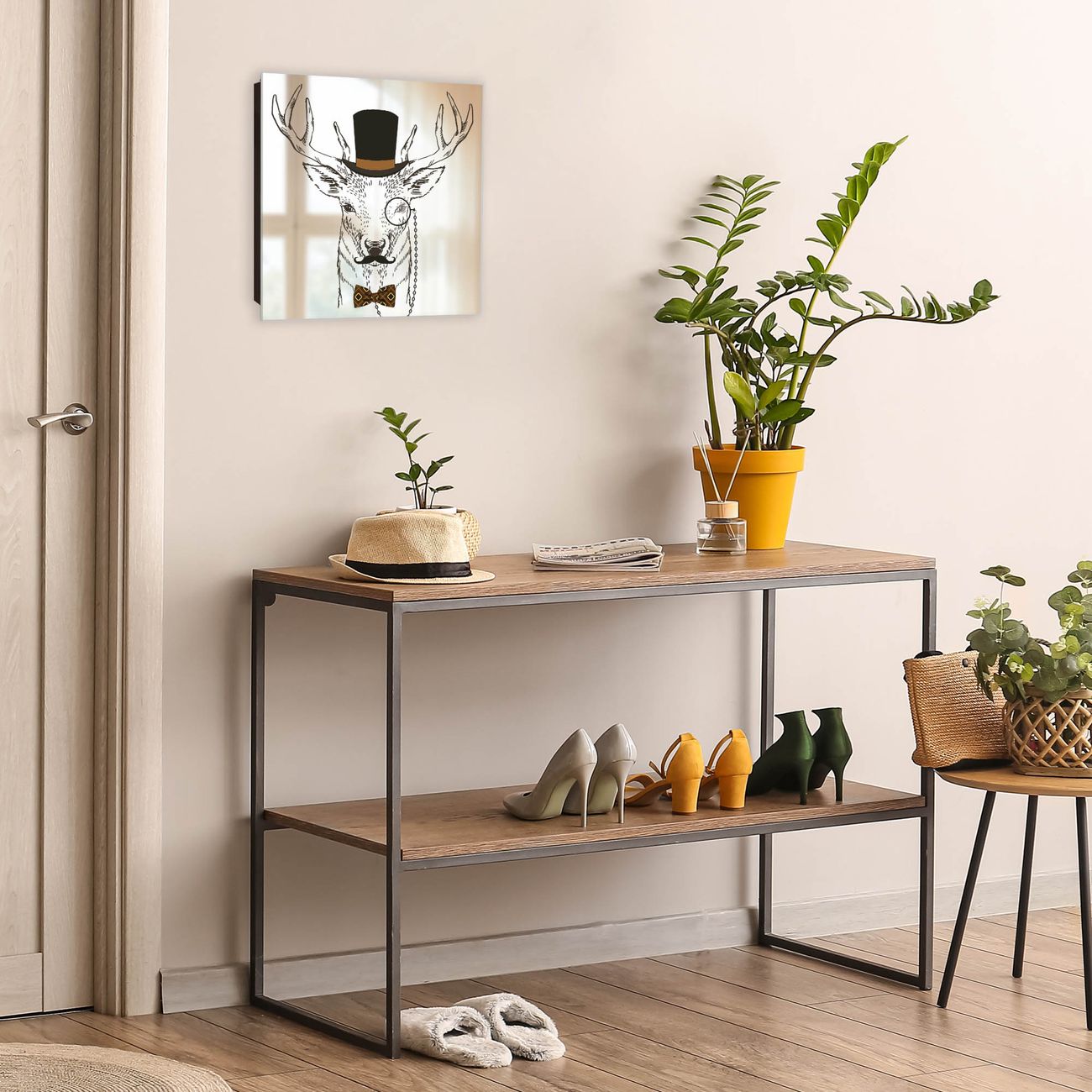 Bringe Ordnung und Stil in deinen Eingangsbereich mit dem banjado Schlüsselkasten mit Spiegel. Die elegante Spiegelfront kombiniert Funktionalität mit modernem Design und macht die Schlüsselaufbewahrung zu einem dekorativen Highlight. ✅ Spiegel Schlüsselaufbewahrung mit Motiv Motiv Direktor Hirsch Der Design-Schlüsselkasten Motiv Motiv Direktor Hirsch bietet Platz für bis zu 50 Schlüssel, die auf 5 stabilen Reihen mit je 10 Haken übersichtlich verstaut werden. Mit seinen kompakten Maßen von 30 x 30 x 5 cm passt die Schlüsselbox perfekt auch in kleinere Räume. Der schwarz lackierte Stahlkorpus mit rechts angeschlagenem Türscharnier harmoniert mit der Spiegelfront und fügt sich nahtlos in jedes Wohnambiente ein. Ob als Schlüsselorganizer für Zuhause oder als praktische Lösung für Büros, Praxen und Gewerbe, der banjado Schlüsselkasten sorgt für Ordnung und Übersicht. Die Spiegelfront verleiht dem Eingangsbereich zusätzliche Funktionalität und lässt Räume optisch größer wirken. Die Schlüsselbox Motiv Motiv Direktor Hirsch zur Wandmontage wird inklusive Befestigungsmaterial geliefert und ist schnell angebracht. So hast du deine Schlüssel jederzeit griffbereit und zugleich stilvoll verstaut. Mit diesem banjado Schlüsselkasten Motiv Motiv Direktor Hirsch kombinierst du praktische Aufbewahrung mit stilvollem Wohndesign. Ob privat oder geschäftlich, die Schlüsselbox sorgt für mehr Ordnung, Übersicht und ein wohnliches Ambiente.Vorteile im Überblick
