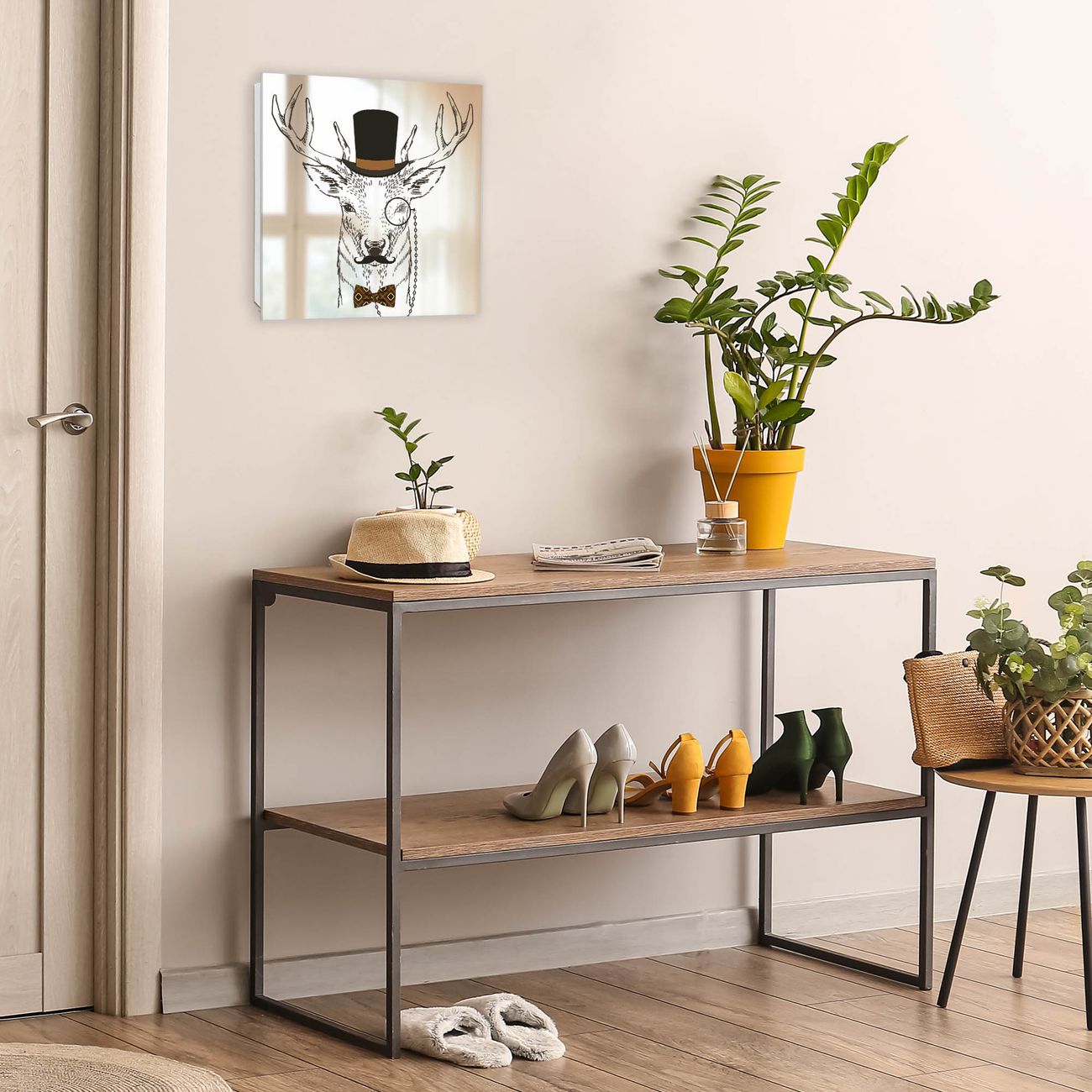 Bringe Ordnung und Stil in deinen Eingangsbereich mit dem banjado Schlüsselkasten mit Spiegel. Die elegante Spiegelfront kombiniert Funktionalität mit modernem Design und macht die Schlüsselaufbewahrung zu einem dekorativen Highlight. ✅ Spiegel Schlüsselaufbewahrung mit Motiv Motiv Direktor Hirsch Der Design-Schlüsselkasten Motiv Motiv Direktor Hirsch bietet Platz für bis zu 50 Schlüssel, die auf 5 stabilen Reihen mit je 10 Haken übersichtlich verstaut werden. Mit seinen kompakten Maßen von 30 x 30 x 5 cm passt die Schlüsselbox perfekt auch in kleinere Räume. Der weiß lackierte Stahlkorpus mit rechts angeschlagenem Türscharnier harmoniert mit der Spiegelfront und fügt sich nahtlos in jedes Wohnambiente ein. Ob als Schlüsselorganizer für Zuhause oder als praktische Lösung für Büros, Praxen und Gewerbe, der banjado Schlüsselkasten sorgt für Ordnung und Übersicht. Die Spiegelfront verleiht dem Eingangsbereich zusätzliche Funktionalität und lässt Räume optisch größer wirken. Die Schlüsselbox Motiv Motiv Direktor Hirsch zur Wandmontage wird inklusive Befestigungsmaterial geliefert und ist schnell angebracht. So hast du deine Schlüssel jederzeit griffbereit und zugleich stilvoll verstaut. Mit diesem banjado Schlüsselkasten Motiv Motiv Direktor Hirsch kombinierst du praktische Aufbewahrung mit stilvollem Wohndesign. Ob privat oder geschäftlich, die Schlüsselbox sorgt für mehr Ordnung, Übersicht und ein wohnliches Ambiente.Vorteile im Überblick