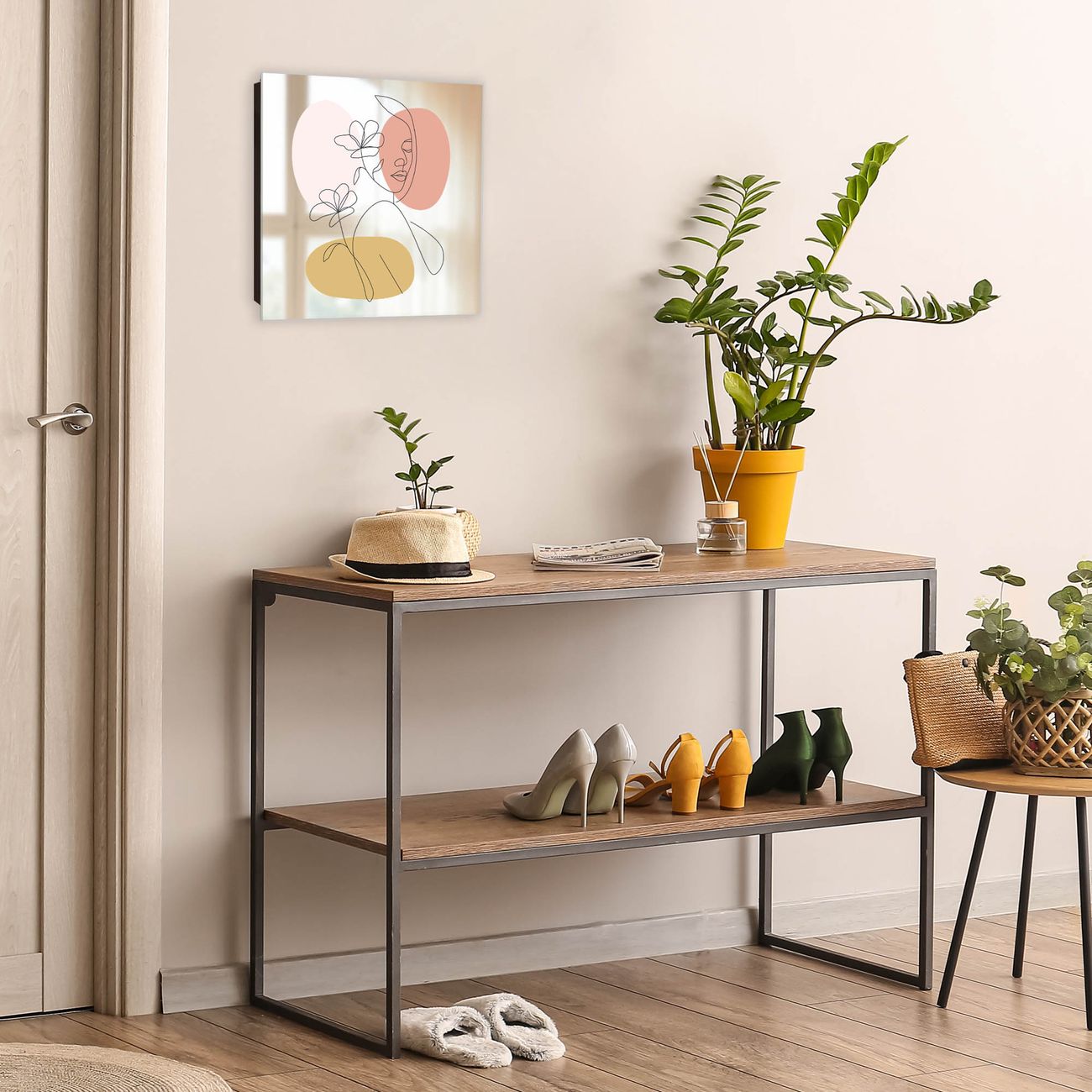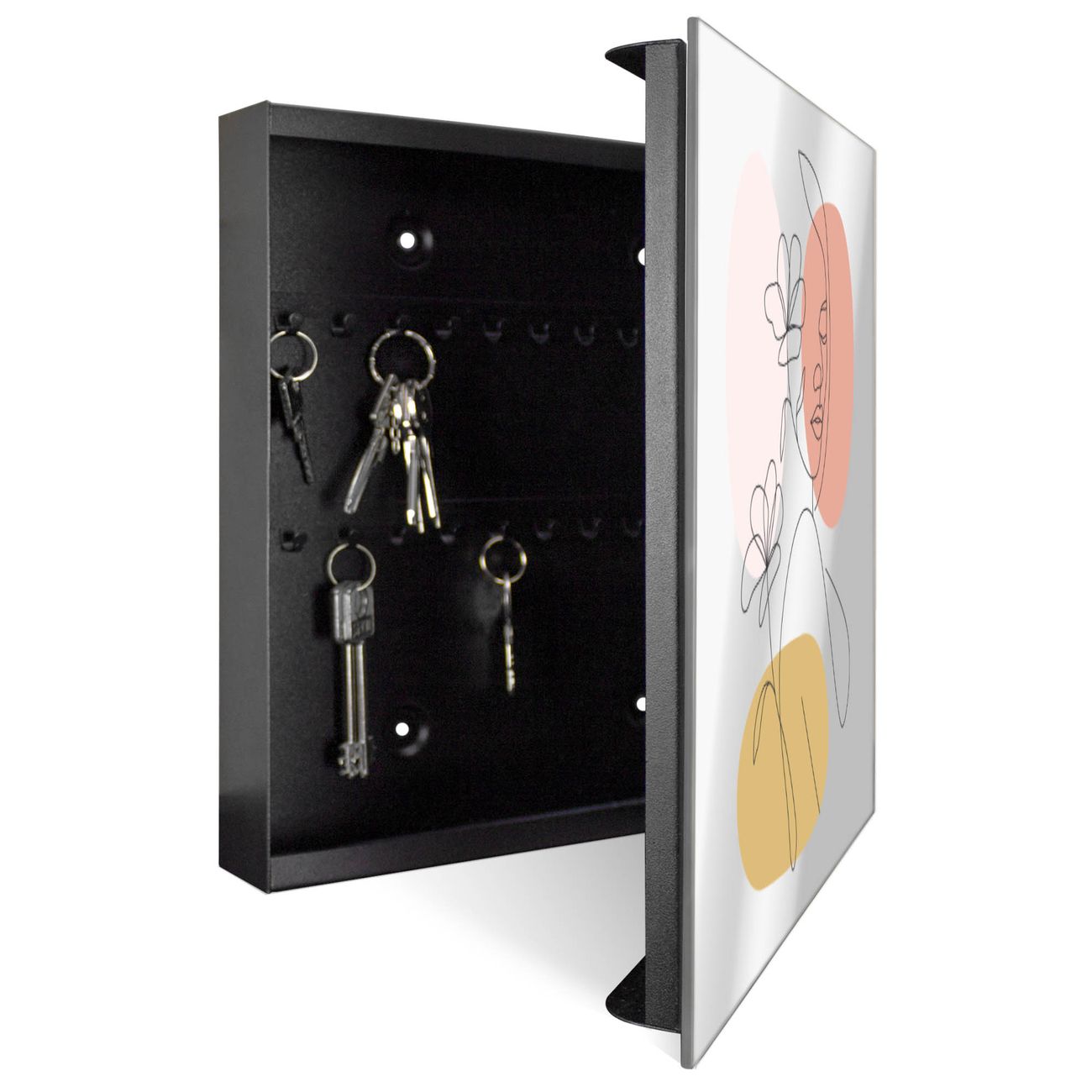 Bringe Ordnung und Stil in deinen Eingangsbereich mit dem banjado Schlüsselkasten mit Spiegel. Die elegante Spiegelfront kombiniert Funktionalität mit modernem Design und macht die Schlüsselaufbewahrung zu einem dekorativen Highlight. ✅ Spiegel Schlüsselaufbewahrung mit Motiv Motiv Elegante Linienblüte Der Design-Schlüsselkasten Motiv Motiv Elegante Linienblüte bietet Platz für bis zu 50 Schlüssel, die auf 5 stabilen Reihen mit je 10 Haken übersichtlich verstaut werden. Mit seinen kompakten Maßen von 30 x 30 x 5 cm passt die Schlüsselbox perfekt auch in kleinere Räume. Der schwarz lackierte Stahlkorpus mit rechts angeschlagenem Türscharnier harmoniert mit der Spiegelfront und fügt sich nahtlos in jedes Wohnambiente ein. Ob als Schlüsselorganizer für Zuhause oder als praktische Lösung für Büros, Praxen und Gewerbe, der banjado Schlüsselkasten sorgt für Ordnung und Übersicht. Die Spiegelfront verleiht dem Eingangsbereich zusätzliche Funktionalität und lässt Räume optisch größer wirken. Die Schlüsselbox Motiv Motiv Elegante Linienblüte zur Wandmontage wird inklusive Befestigungsmaterial geliefert und ist schnell angebracht. So hast du deine Schlüssel jederzeit griffbereit und zugleich stilvoll verstaut. Mit diesem banjado Schlüsselkasten Motiv Motiv Elegante Linienblüte kombinierst du praktische Aufbewahrung mit stilvollem Wohndesign. Ob privat oder geschäftlich, die Schlüsselbox sorgt für mehr Ordnung, Übersicht und ein wohnliches Ambiente.Vorteile im Überblick