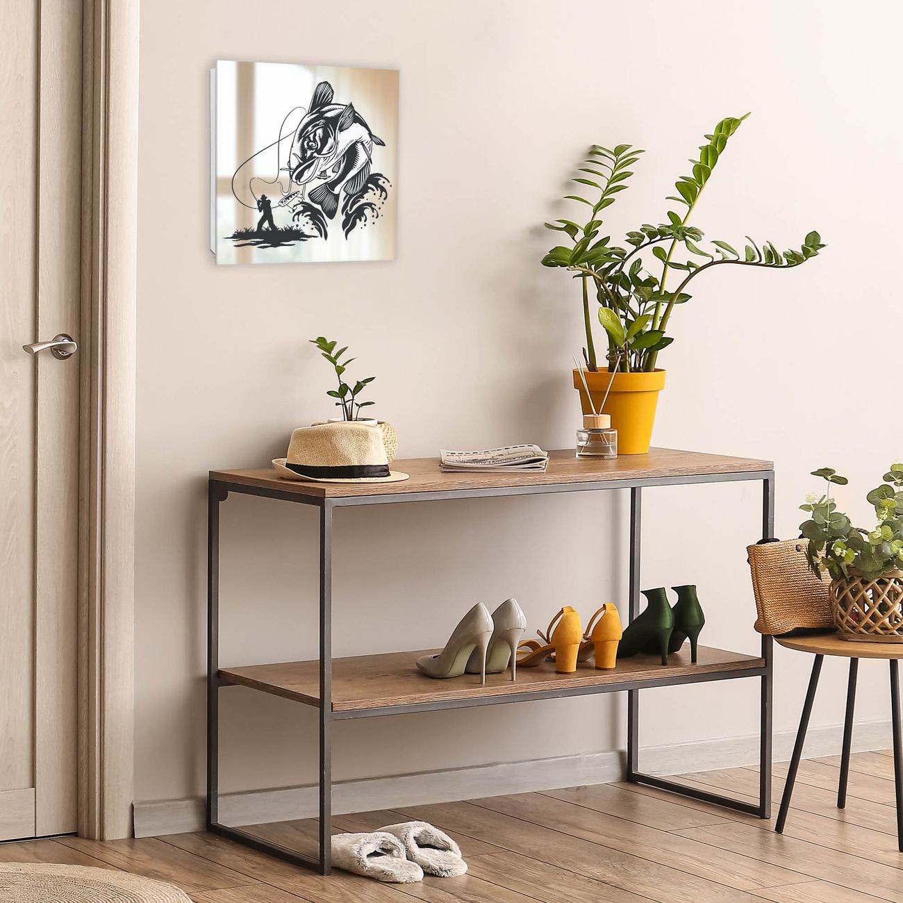 Bringe Ordnung und Stil in deinen Eingangsbereich mit dem banjado Schlüsselkasten mit Spiegel. Die elegante Spiegelfront kombiniert Funktionalität mit modernem Design und macht die Schlüsselaufbewahrung zu einem dekorativen Highlight. ✅ Spiegel Schlüsselaufbewahrung mit Motiv Motiv Fischfang Abenteuer Der Design-Schlüsselkasten Motiv Motiv Fischfang Abenteuer bietet Platz für bis zu 50 Schlüssel, die auf 5 stabilen Reihen mit je 10 Haken übersichtlich verstaut werden. Mit seinen kompakten Maßen von 30 x 30 x 5 cm passt die Schlüsselbox perfekt auch in kleinere Räume. Der weiß lackierte Stahlkorpus mit rechts angeschlagenem Türscharnier harmoniert mit der Spiegelfront und fügt sich nahtlos in jedes Wohnambiente ein. Ob als Schlüsselorganizer für Zuhause oder als praktische Lösung für Büros, Praxen und Gewerbe, der banjado Schlüsselkasten sorgt für Ordnung und Übersicht. Die Spiegelfront verleiht dem Eingangsbereich zusätzliche Funktionalität und lässt Räume optisch größer wirken. Die Schlüsselbox Motiv Motiv Fischfang Abenteuer zur Wandmontage wird inklusive Befestigungsmaterial geliefert und ist schnell angebracht. So hast du deine Schlüssel jederzeit griffbereit und zugleich stilvoll verstaut. Mit diesem banjado Schlüsselkasten Motiv Motiv Fischfang Abenteuer kombinierst du praktische Aufbewahrung mit stilvollem Wohndesign. Ob privat oder geschäftlich, die Schlüsselbox sorgt für mehr Ordnung, Übersicht und ein wohnliches Ambiente.Vorteile im Überblick